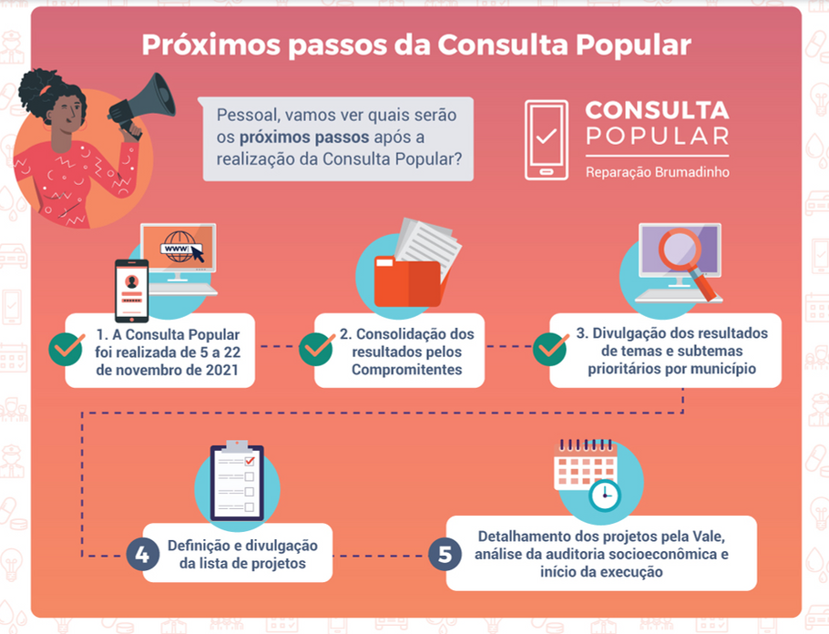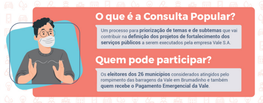A Consulta Popular é uma das ações previstas para a execução do Acordo Judicial de Reparação assinado entre os compromitentes – Governo do Estado, Ministério Público de Minas Gerais (MPMG), Ministério Público Federal (MPF) e Defensoria Pública de Minas Gerais (DPMG) – e a compromissária Vale S.A, e homologado pelo Tribunal de Justiça de Minas Gerais (TJMG) em 4 de fevereiro de 2021.