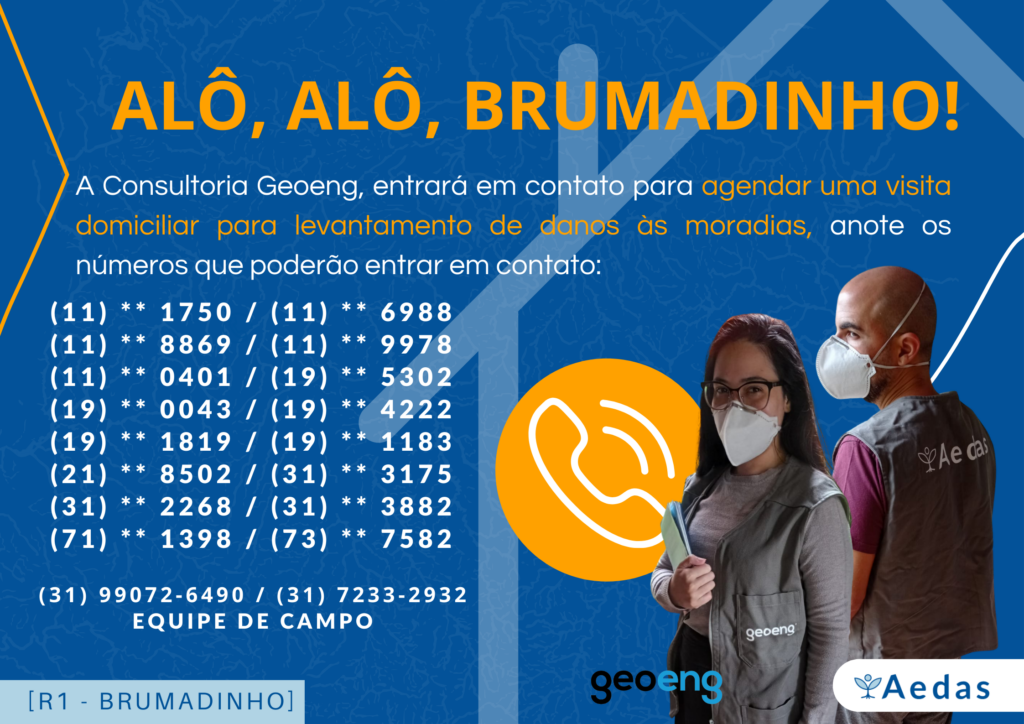 Está em campo a partir de dezembro de 2021 a consultoria técnica especializada contratada pela Aedas para realizar o LEVANTAMENTO DE DANOS À MORADIA, INFRAESTRUTURA E BENS MÓVEIS (Termo de Referência 03/2021) provocados pelo rompimento da barragem da Mina Córrego do Feijão, da empresa VALE S.A, pelo espalhamento do rejeito e pelas obras de reparação.