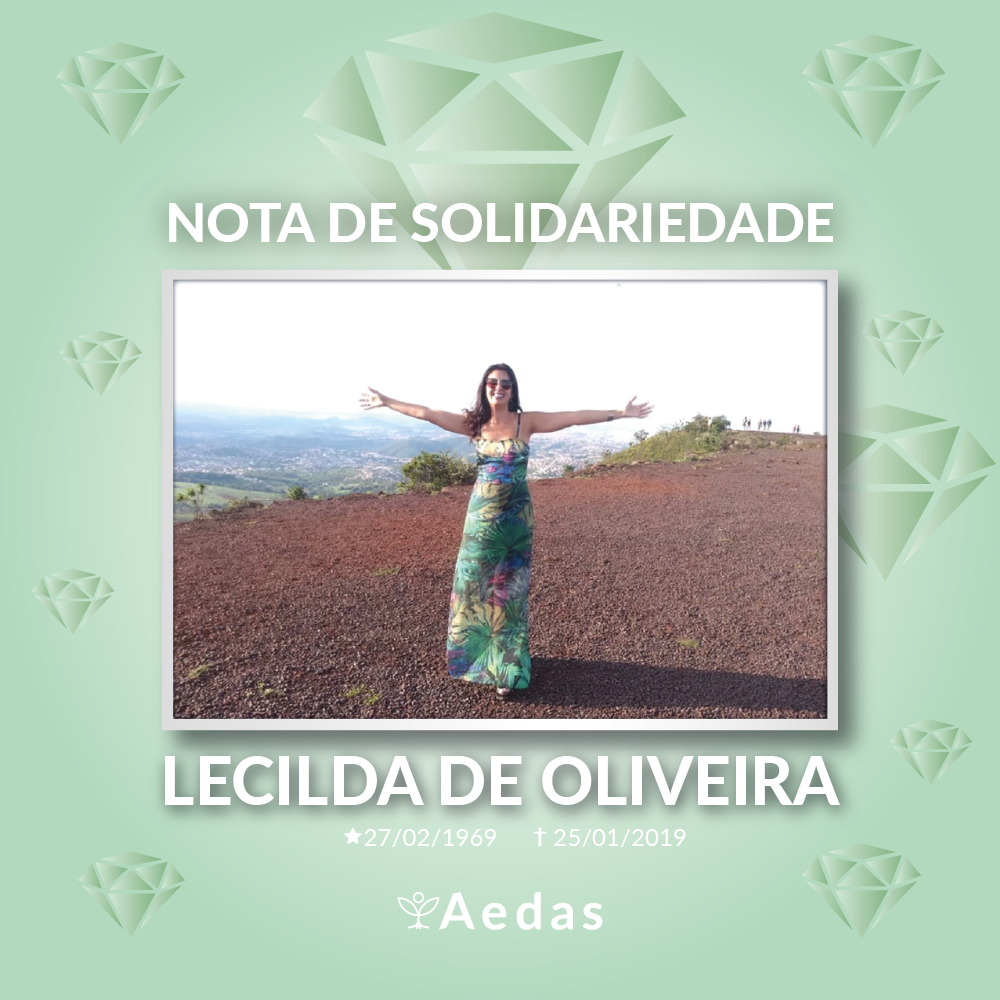 A Associação Estadual de Defesa Ambiental e Social (Aedas) presta solidariedade aos familiares e amigos da vítima Lecilda de Oliveira, de 49 anos, identificada na última quarta-feira, 29 de dezembro, através dos trabalhos das equipes do Instituto de Criminalística, a partir de material de DNA. Natural de Brumadinho, na Região Metropolitana de Belo Horizonte, Lecilda de Oliveira fez faculdade de administração na própria cidade. Lá, ela criou seus dois filhos e fez carreira na mineradora Vale como analista de operação, trabalhando na empresa por volta de 29 anos.