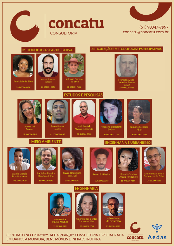 A CONCATU é a empresa contratada para a execução da consultoria e já está em campo com um grupo de 15 pesquisadores de diferentes áreas do conhecimento, empenhados em levantar as informações técnicas que serão utilizadas no aprofundamento dos danos nas áreas de Moradia, Infraestrutura e Bens Móveis em Brumadinho. Ao todo a equipe conta com 22 profissionais.