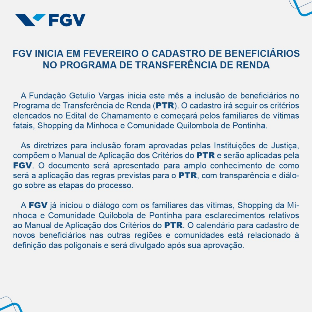 A Fundação Getúlio Vargas (FGV), responsável por administrar o pagamento do Programa de Transferência de Renda (PTR), comunicou nesta sexta-feira, 11, que iniciará, ainda em fevereiro, o processo de cadastro e inclusão de novas pessoas atingidas no PTR.