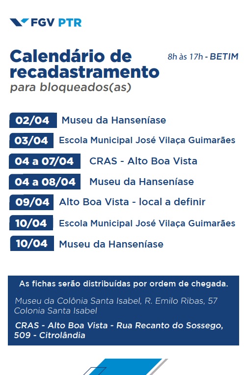 A FGV, que é quem está administrando o PTR desde novembro de 2021, divulgou um cronograma para os atendimentos presenciais para as pessoas de Betim. Lembrando que a solicitação de recadastramento também pode ser feita pela internet (Clique aqui e veja tutorial).