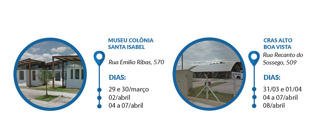 Atenção aos fins de semana! Nos dias 3 (domingo) e 9/04 (sábado), o atendimento será no Alto da Boa Vista, mas o local ainda não foi definido. No dia 10/04 (domingo), o local do atendimento nos dois pontos, Alto da Boa Vista e Colônia Santa Isabel, também será definido.
