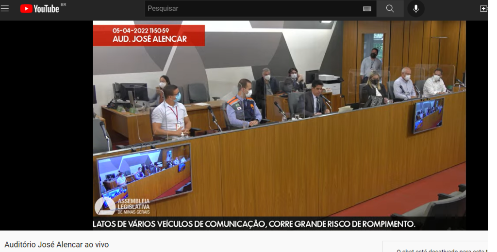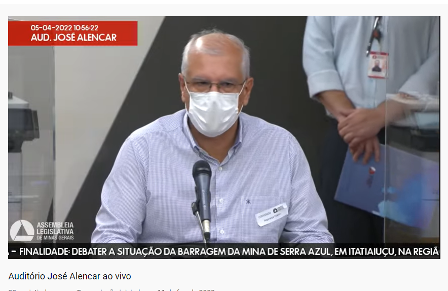 Na terça-feira, 05 de abril de 2022, foi realizada Audiência Pública na Assembleia Legislativa de Minas Gerais, com o objetivo debater a situação da barragem da Mina de Serra Azul, em Itatiaiuçu, que foi reclassificada para o nível 3 de emergência. A audiência foi proposta pelo requerimento do deputado João Leite e foi presidida pelo deputado Sargento Rodrigues.