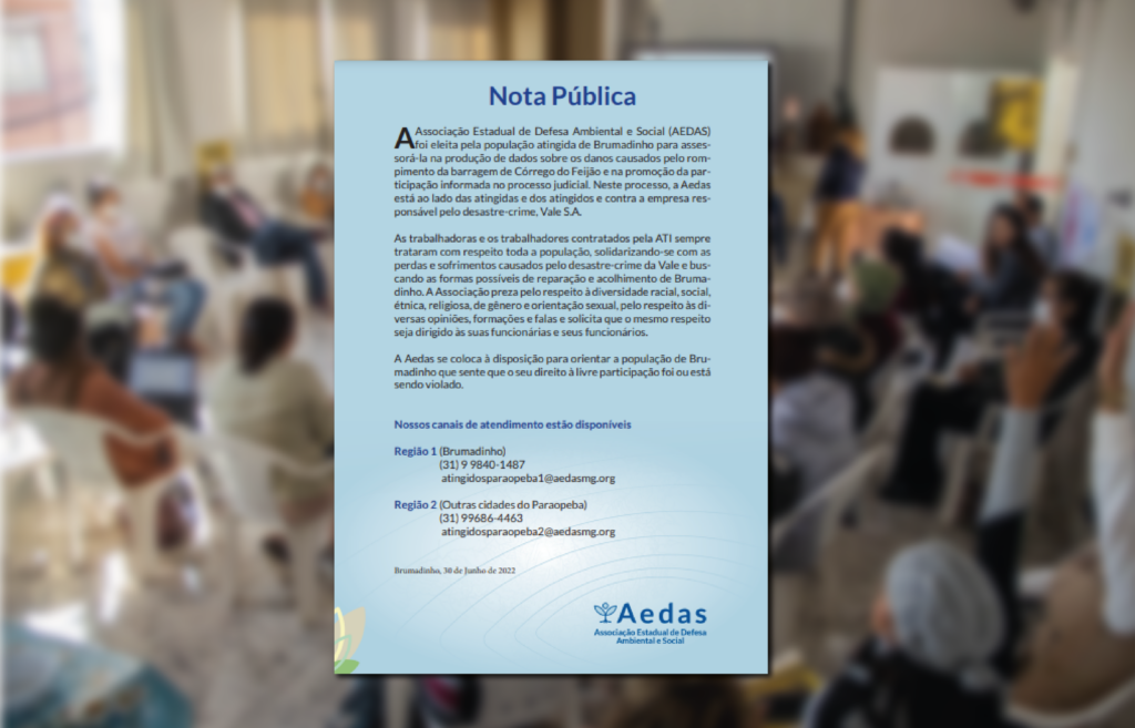 A Associação Estadual de Defesa Ambiental e Social (Aedas) foi eleita pela população atingida de Brumadinho para assessorá-la na produção de dados sobre os danos causados pelo rompimento da barragem de Córrego do Feijão e na promoção da participação informada no processo judicial. Neste processo, a Aedas está ao lado das atingidas e dos atingidos e contra a empresa responsável pelo desastre-crime, Vale S.A.
