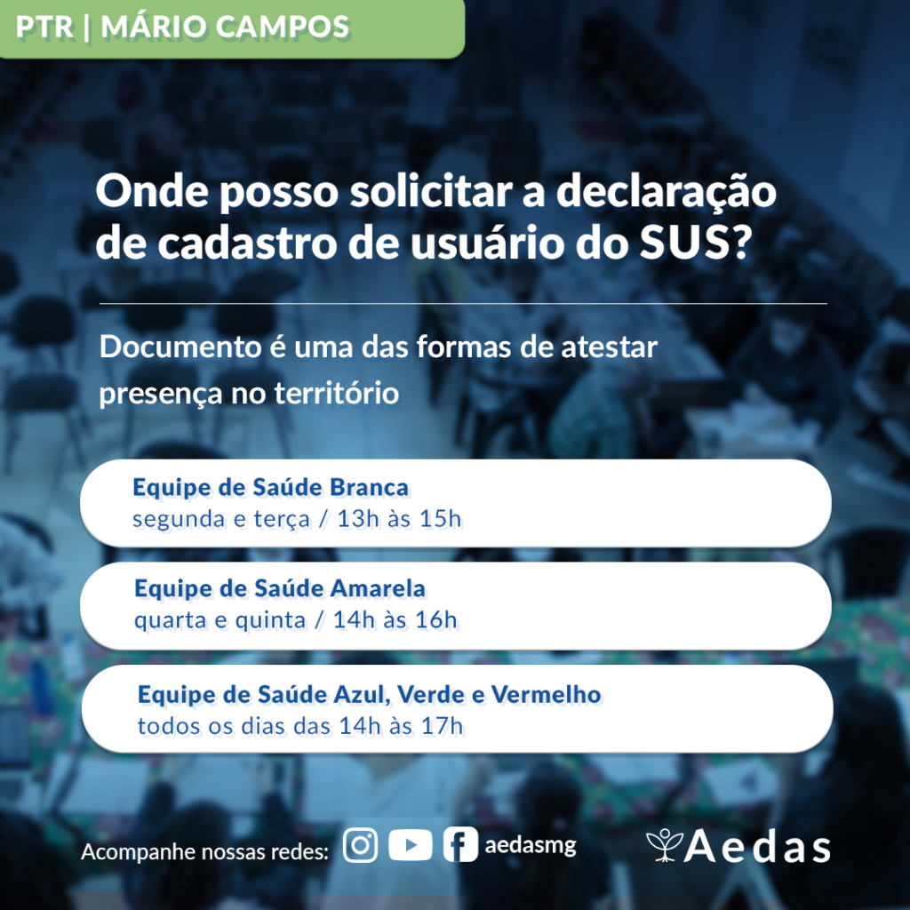 A equipe da Aedas aconselha as pessoas atingidas de Mário Campos, que ainda não tenham esse comprovante, que procurem uma Unidade de Saúde da Família assim que possível, para que, nos dias 19, 27 e 29 de agosto, já tenham a declaração em mãos, para apresentar no atendimento do PTR.