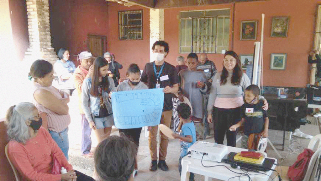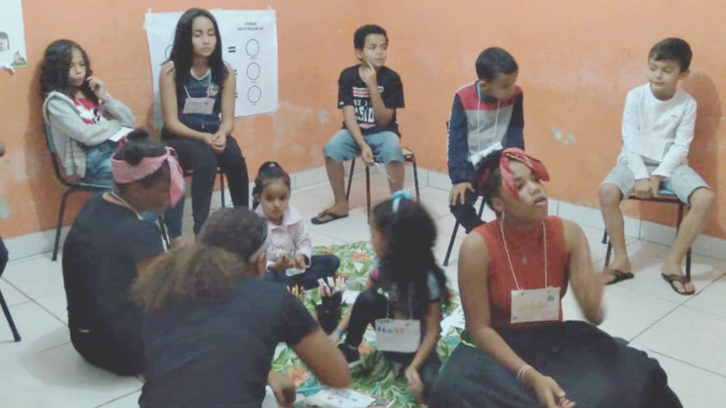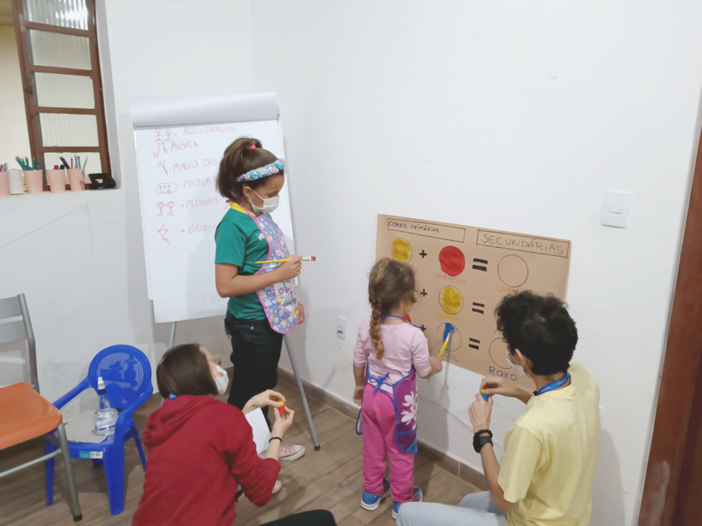 Alongamento, jogo de trilha sobre crédito e microcrédito, brincadeiras livres e outras atividades foram realizadas com as crianças nas reuniões presenciais das Rodas de Diálogo.