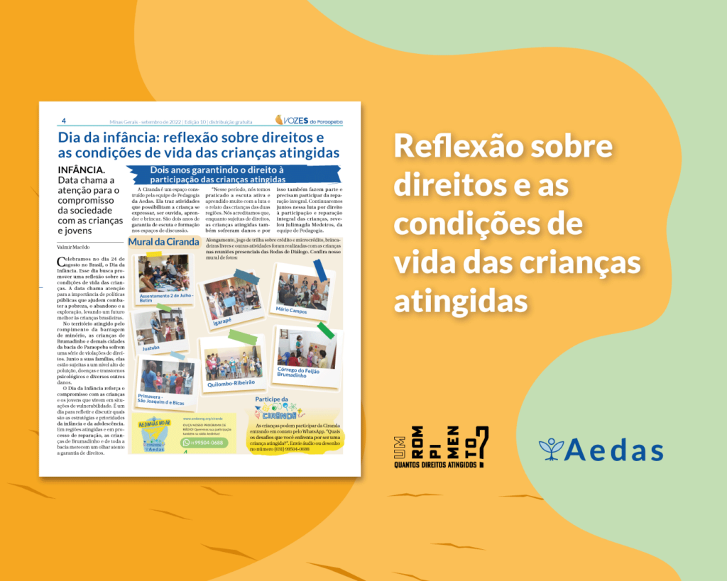Em regiões atingidas e em processo de reparação, as crianças de Brumadinho e de toda a bacia merecem um olhar atento a garantia de direitos.