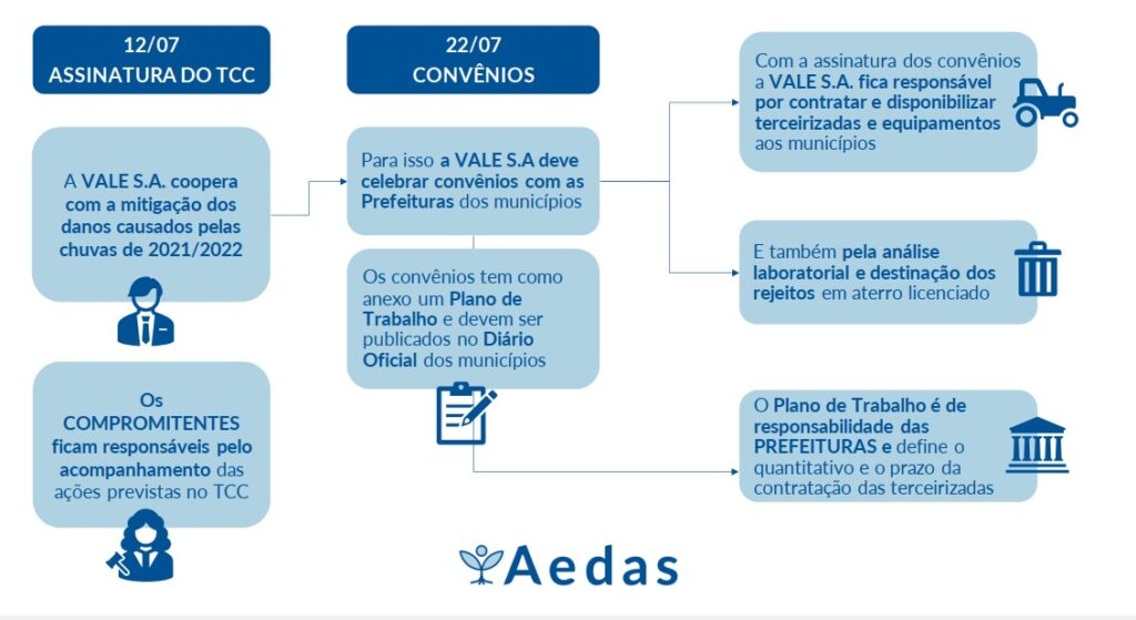 O Termo de Compromisso e Cooperação (TCC) foi assinado em 12 de julho de 2022 entre a VALE S.A e os Compromitentes para regular a contratação de empresas terceirizadas para limpeza, remoção, transporte e destinação dos resíduos e sedimentos despejados pelo rompimento da Barragem da Mina Córrego do Feijão em 2019 no Rio Paraopeba e que, posteriormente, foram espalhados pelas fortes chuvas de dezembro de 2021 a janeiro de 2022, resultando na deposição desses sedimentos em diversas áreas públicas e privadas.
