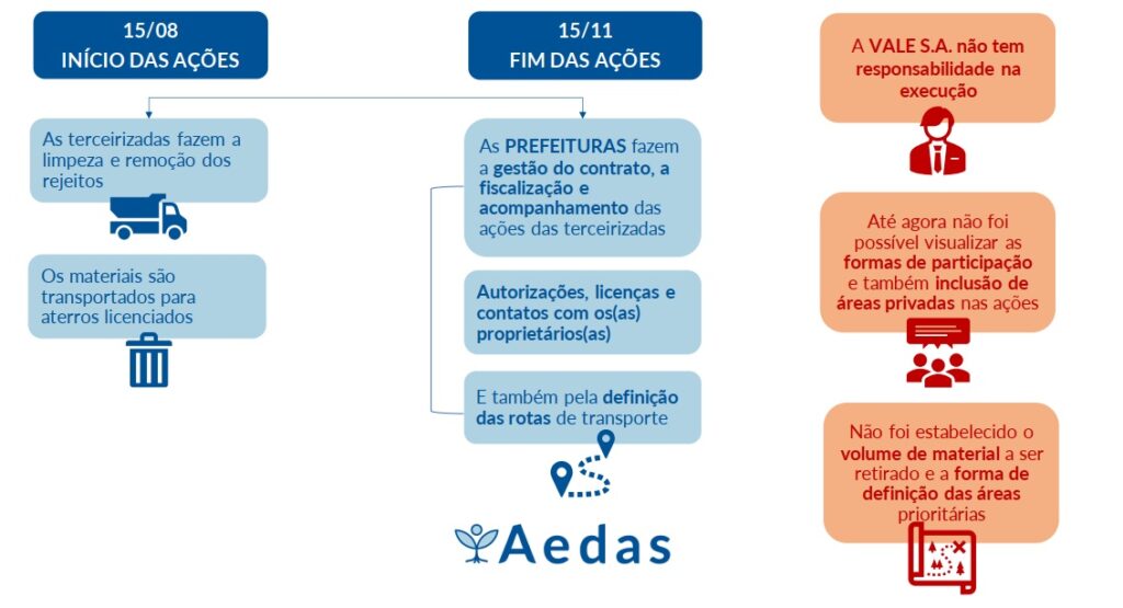 A Aedas buscou caminhos para promover a participação informada das pessoas atingidas por meio de ofícios destinados aos Compromitentes e Prefeituras, solicitando detalhamento sobre a abrangência das ações e a possibilidade de indicação de outras áreas para limpeza.
