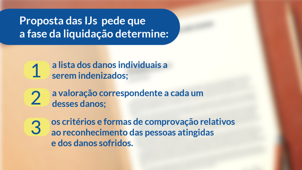 A solicitação das IJs é que a fase de liquidação determine: 1) a lista dos danos individuais a serem indenizados; 2) a valoração correspondente a cada um desses danos; 3) os critérios e formas de comprovação relativos ao reconhecimento das pessoas atingidas e dos danos sofridos. Com a finalidade de criar os procedimentos e metodologias adequadas à realização desse fim, as Instituições de Justiça indicaram que será contratada uma perícia técnica e imparcial.