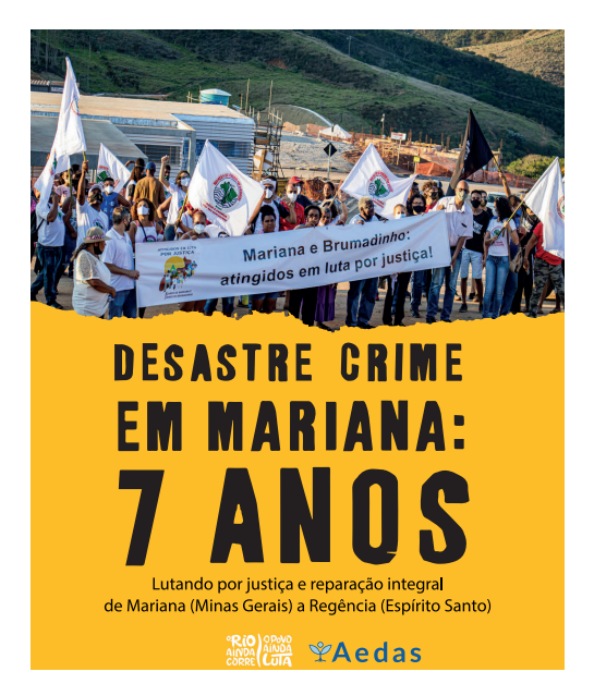 Passados 7 anos do rompimento em Mariana – onde uma avalanche com mais de 50 milhões de metros cúbicos de rejeito de minério foram despejados em terrenos e na bacia do Rio Doce, configurando como um dos maiores desastres crimes socioambientais da história do Brasil – faz com que o povo continua na luta e clamor por justiça e reparação justa, devida e integral.