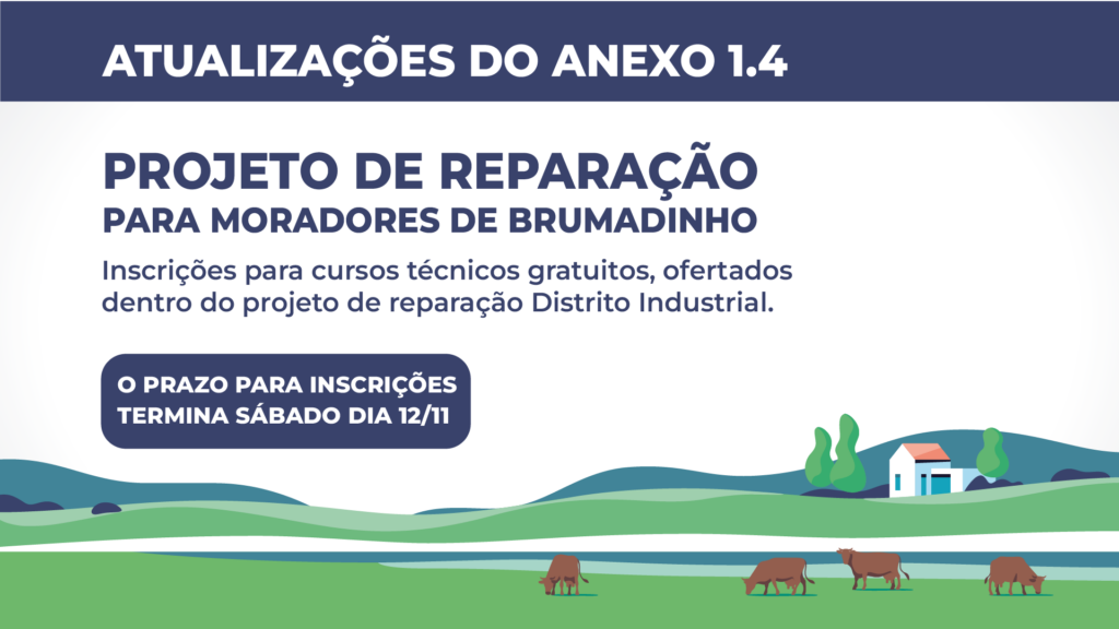 A equipe do Comitê Gestor Pró-Brumadinho da Secretaria de Estado de Planejamento e Gestão de Minas Gerais comunicou a abertura das inscrições para três cursos técnicos gratuitos para os moradores de Brumadinho, ofertados dentro do projeto de reparação “Distrito Industrial”, que objetiva diversificar a economia e reduzir a dependência da mineração no município. As inscrições podem ser feitas até este sábado (12).