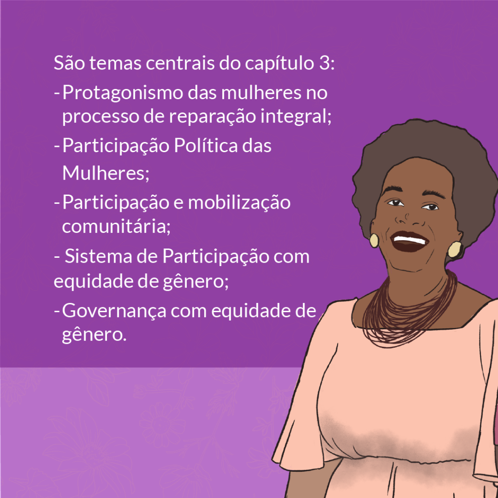 O terceiro capítulo do Dossiê Temático de Gênero tem como foco a análise do protagonismo político e comunitário das mulheres atingidas, bem como sua busca pelo direito à participação social, reconhecendo a importância da presença delas nos processos relacionados à reparação integral.