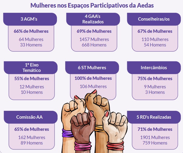 Como fruto destas análises, podemos concluir que em todos os Espaços Participativos e em todas as instâncias informativas, formativas, consultivas e de deliberação realizadas pela AEDAS na região 01, há uma massiva e expressiva participação das mulheres, que por sua vez constituem a sua maioria.
