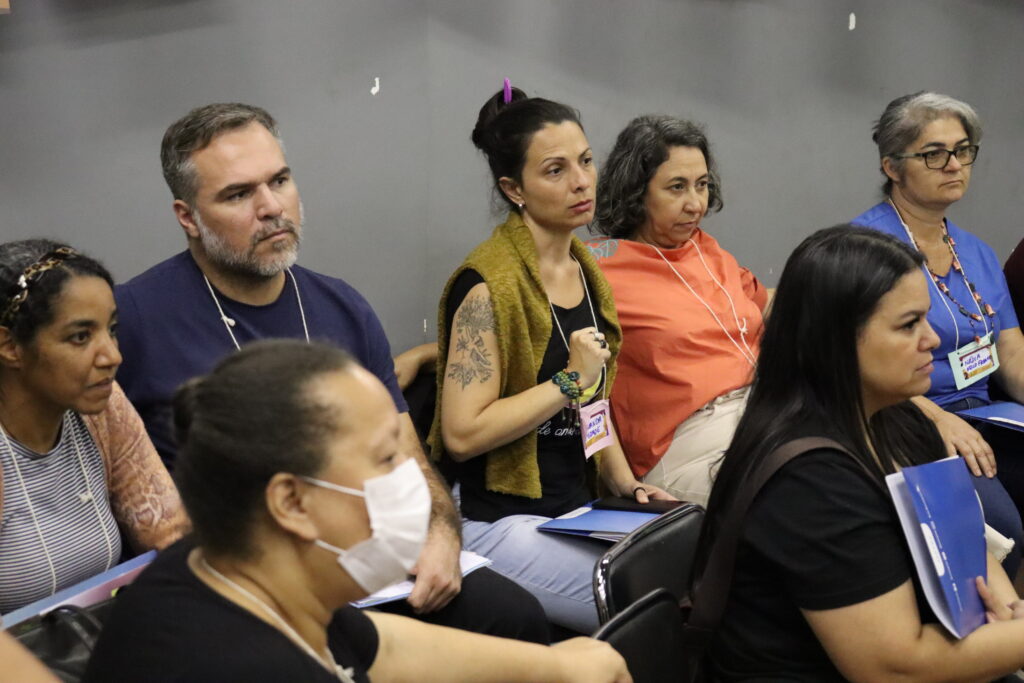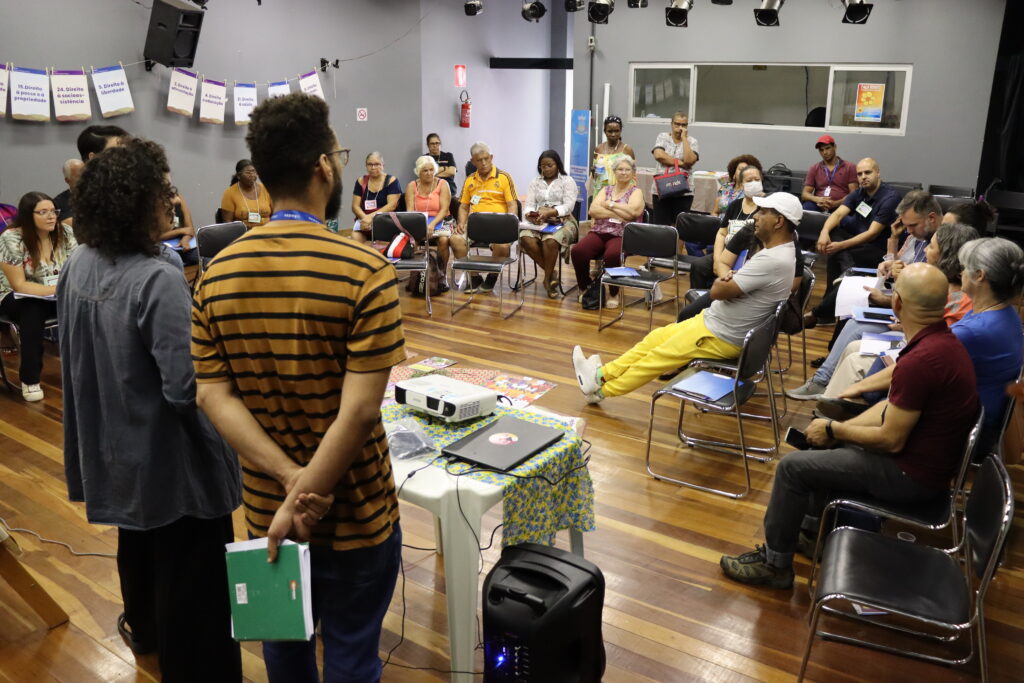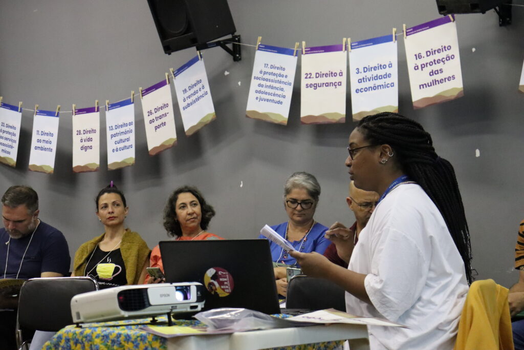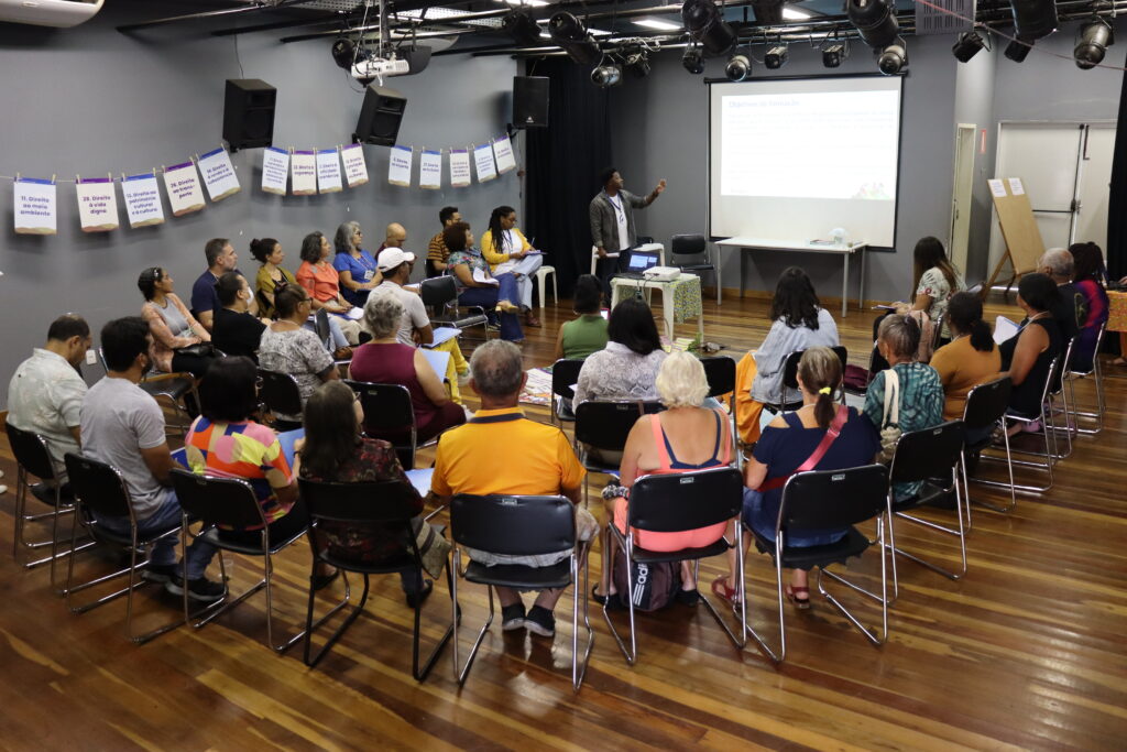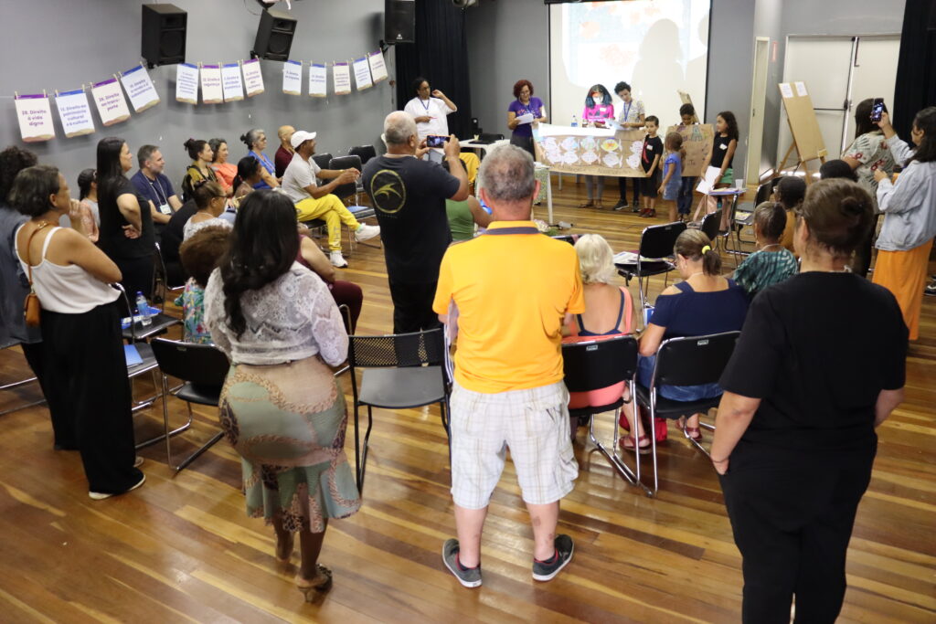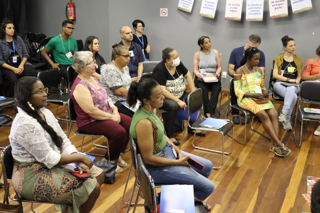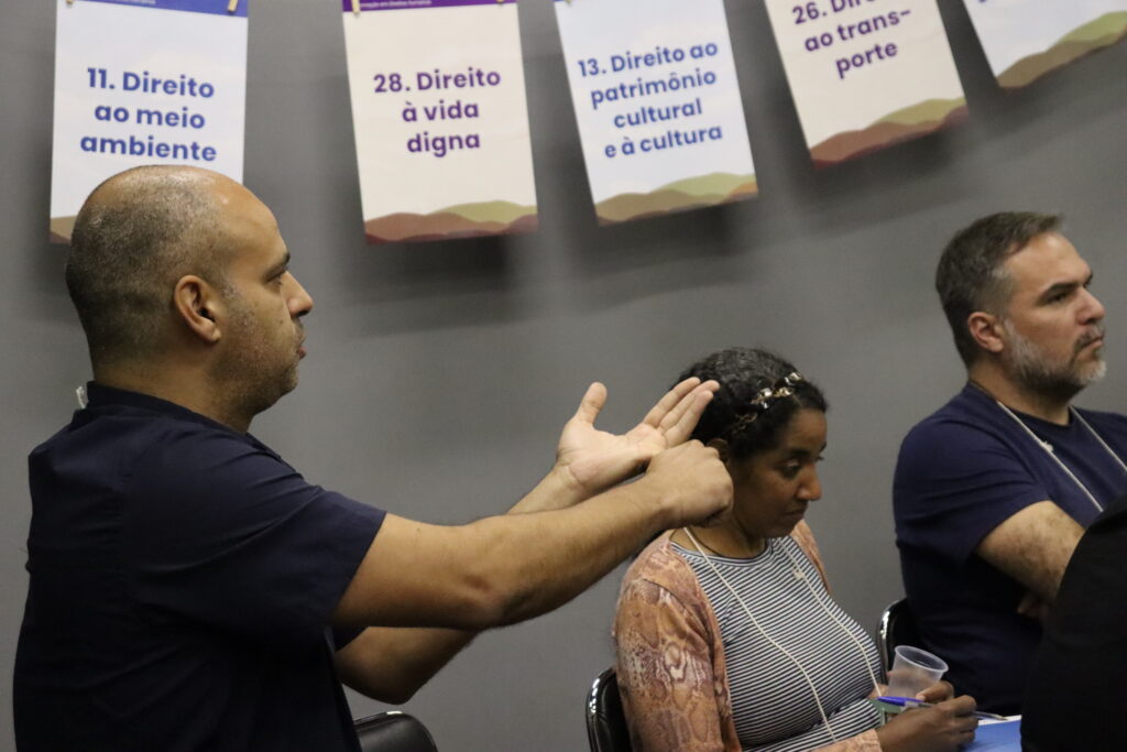 Técnicos e técnicas da Aedas trabalharam na condução dos espaços e o diálogo foi dividido em dois momentos: a discussão sobre o Direito das pessoas que devem ser protegidos e foram apresentados exemplos de como esses direitos são violados para que as pessoas atingidas pudessem compreender como os projetos podem contribuir para a reparação.