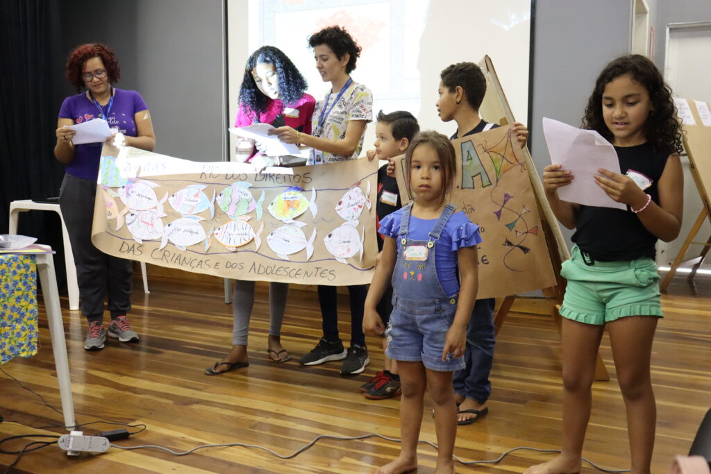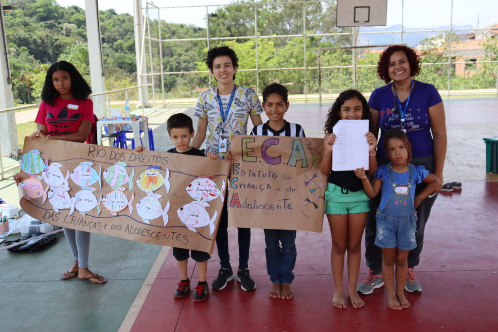 Durante o dia de formação para atingidos e atingidas, as crianças também tiveram seu espaço de diversão, informação e reflexão sobre direitos. A partir de brincadeiras e diálogo, elas construíram uma apresentação lúdica do “Rio de Direitos” apresentada a todos em referência aos vários direitos violados e os que precisam ser resguardados, como o direito à água, à alimentação, à educação e todas as garantias previstas pelo Estatuto da Criança e do Adolescente (ECA).