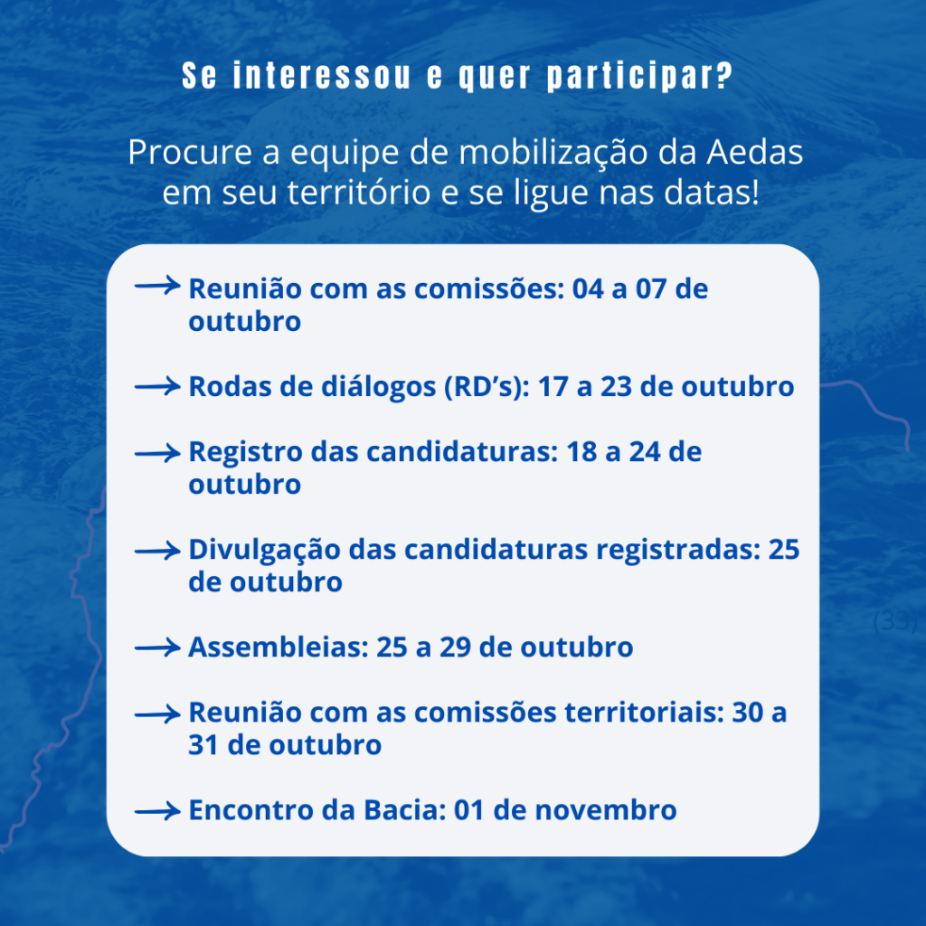 Depois da escolha dos/das representantes das Comissões Locais Municipais/Distritais será o momento de reunir todas as Comissões eleitas para a escolha das representações de instâncias e representantes para o Encontro da Bacia.