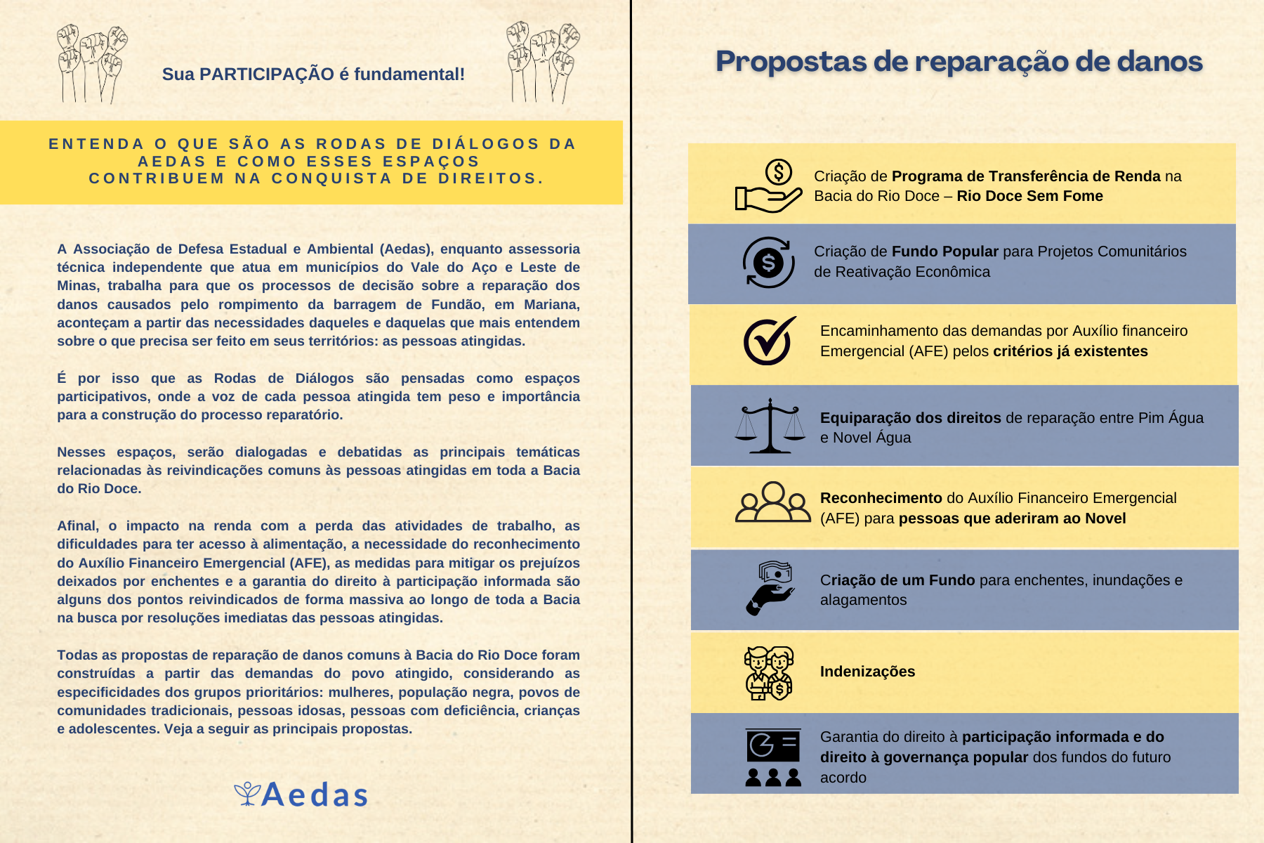 Nas Rodas de Diálogos, espaços de participação popular promovido pela Associação Estadual de Defesa Ambiental e Social (Aedas), as pessoas atingidas debatem propostas necessárias para reparação das consequências e injustiças deixadas pelo rompimento da barragem de Fundão que é, até hoje, considerado o maior desastre socioambiental do Brasil de responsabilidade das empresas Samarco, Vale e BHP Billiton.