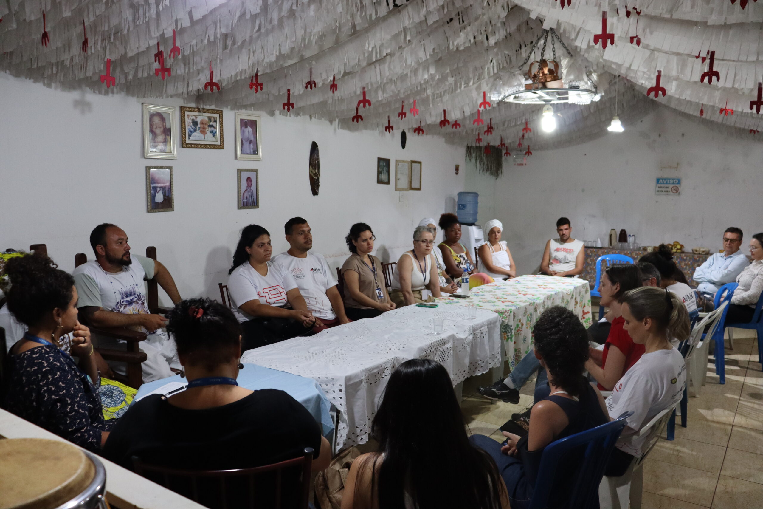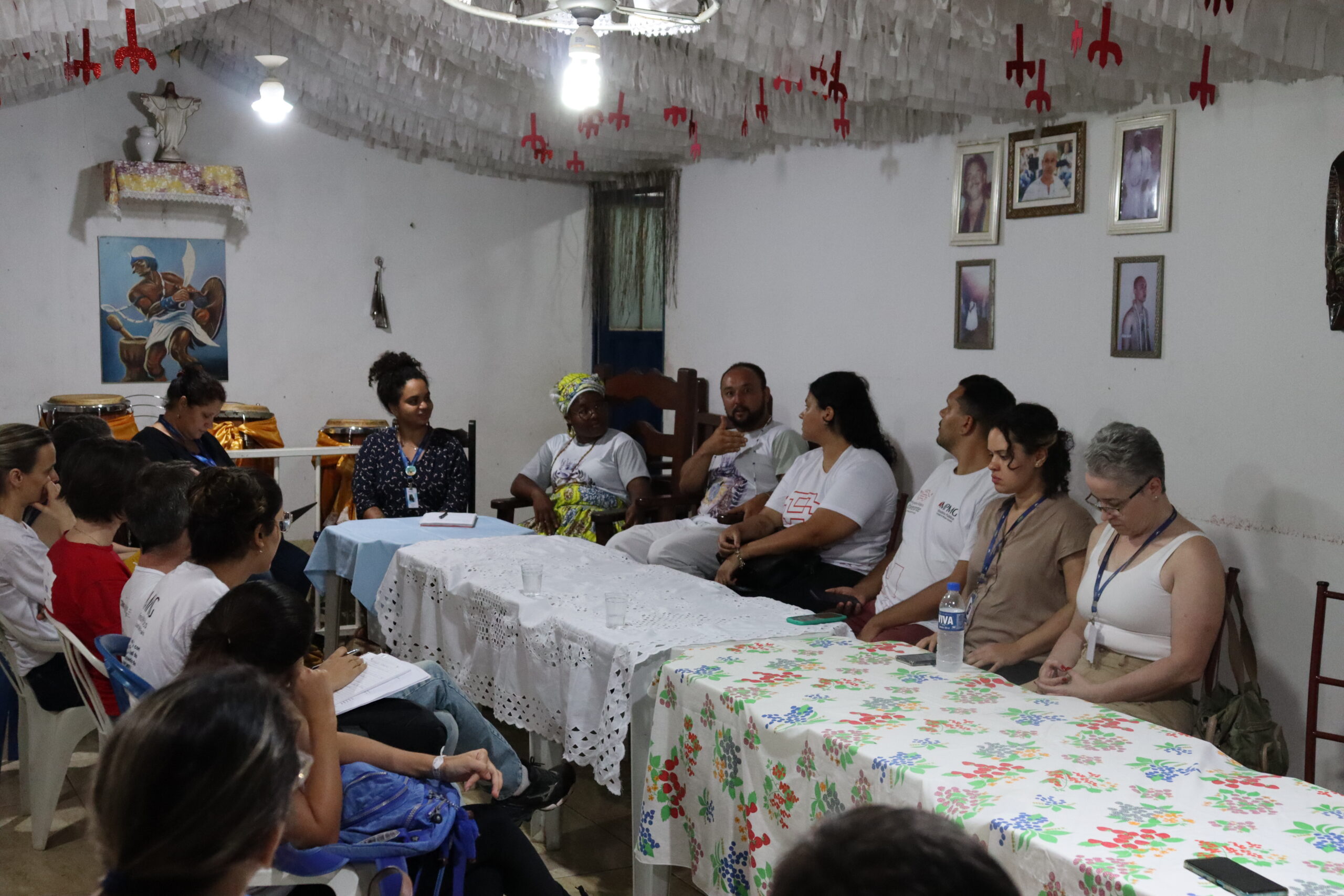 A terceira visita do dia foi realizada na comunidade tradicional de matriz africana terreiro de candomblé Nzo Nguzu Kukia, localizado no município de Mateus Leme e que faz parte do PCTRAMA. Em uma roda de conversa, atingidas e atingidos explicaram para as representantes do Ministério Público como o rompimento e a poluição das águas afetam a manutenção da tradicionalidade.