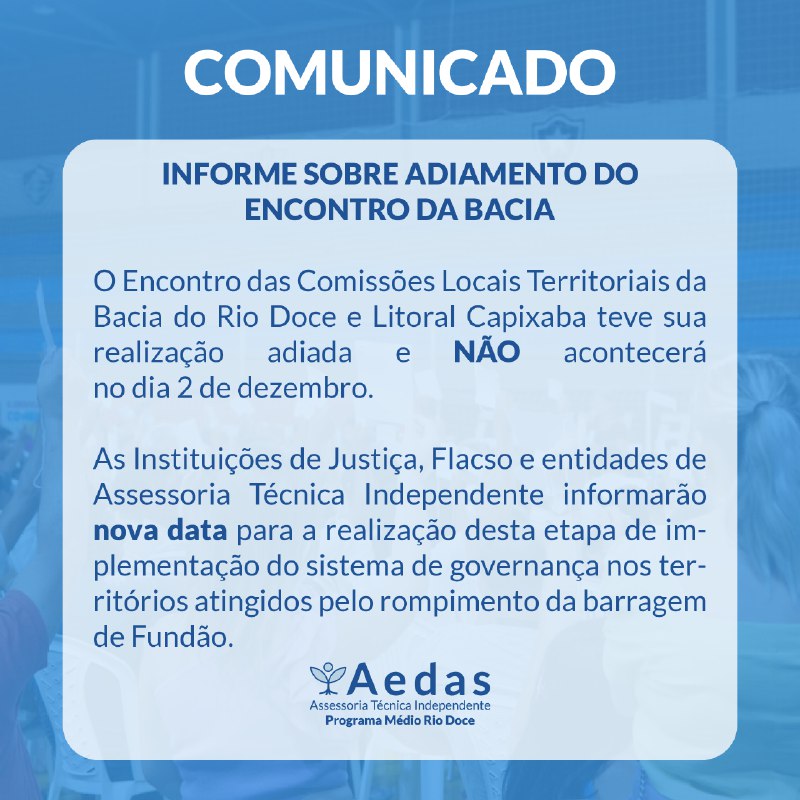 O Encontro das Comissões Locais Territoriais da Bacia do Rio Doce e Litoral Capixaba teve sua realização adiada para uma nova data, a ser alinhada em breve entre Instituições de Justiça, Flacso (instituição responsável pela execução do Orçamento Atingido) e assessorias técnicas independentes que atuam no caso do rompimento da barragem de Fundão, na Bacia do Rio Doce. O encontro, que aconteceria no município de Governador Valadares, foi adiado pela necessidade de maior período de tempo para garantias estruturais e logísticas do evento.