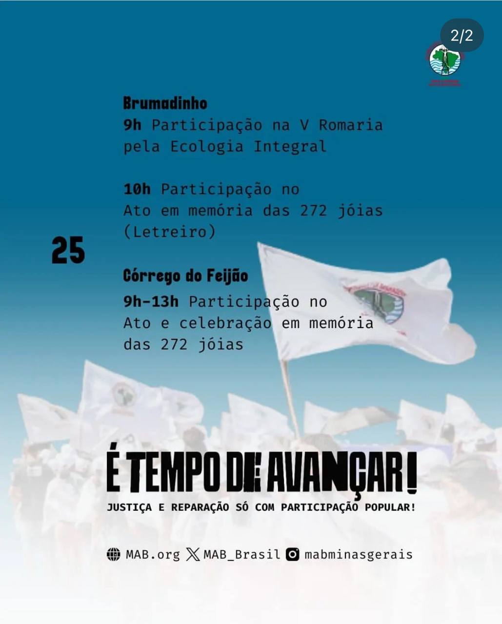 O Movimento dos Atingidos por Barragens (MAB) também fará uma jornada de luta pelos direitos dos atingidos e atingidas da Bacia do Paraopeba. O objetivo da jornada é denunciar as violações em curso ao povo atingido e ao meio ambiente, lutar pela reparação justa, devida e integral, avançar nas conquistas já garantidas para os atingidos e atingidas e celebrar a força da luta do povo.