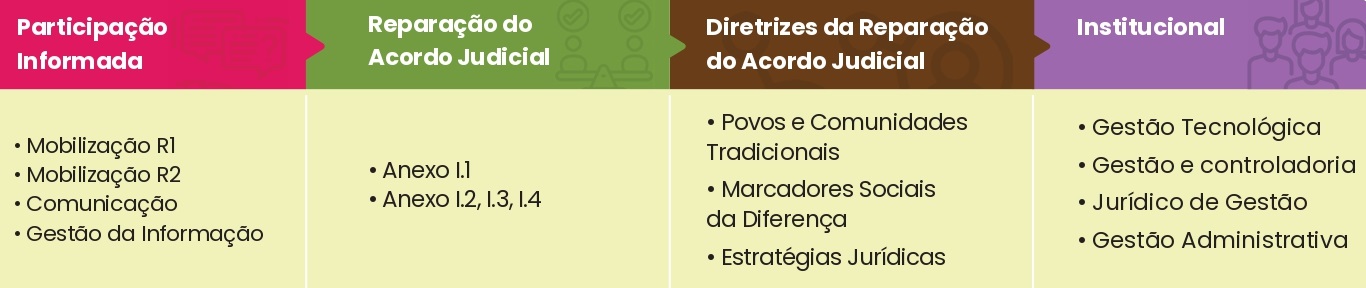 DIRETRIZES DA REPARAÇÃO DO ACORDO JUDICIAL: O Eixo de Diretrizes de Reparação do Acordo Judicial é composto pelas equipes de Marcadores Sociais da Diferença, Estratégias Jurídicas da Reparação e Povos e Comunidades Tradicionais. Essas equipes atuam de forma transversal no projeto e em diálogo permanente com as equipes dos eixos de Reparação e Participação Informada, sendo responsáveis por formular as diretrizes e estratégias para subsidiar os processos de participação informada e reparação, a partir dos estudos, marcos teóricos e normativos que abrangem a diversidade de sujeitos e de direitos dos atingidos assessorados.