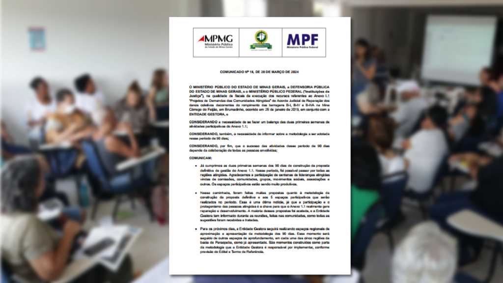 As Instituições de Justiça, em conjunto com a Entidade Gestora, divulgaram nesta quarta-feira (20/03) um comunicado para reforçar a metodologia de trabalho para o período de construção da proposta definitiva dos Projetos de Demandas das Comunidades (Anexo I.1). A publicação também faz um balanço do primeiro momento de diálogo com atingidas e atingidos da Bacia do Paraopeba e Represa de Três Marias.