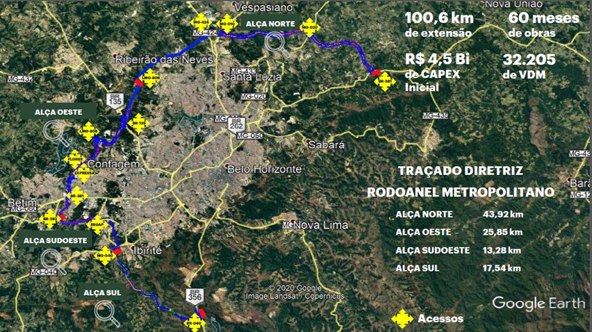 Está em andamento, em Minas Gerais, o processo para a implantação de um megaempreendimento do setor rodoviário, trata-se de um Rodoanel Metropolitano com cerca de 100,6 Km de malha rodoviária, com pista dupla e pedágios, composto por quatro alças/rotas (Norte, Oeste, Sudoeste e Sul), dos 34 municípios da Região Metropolitana de Belo Horizonte, 13 serão impactados.