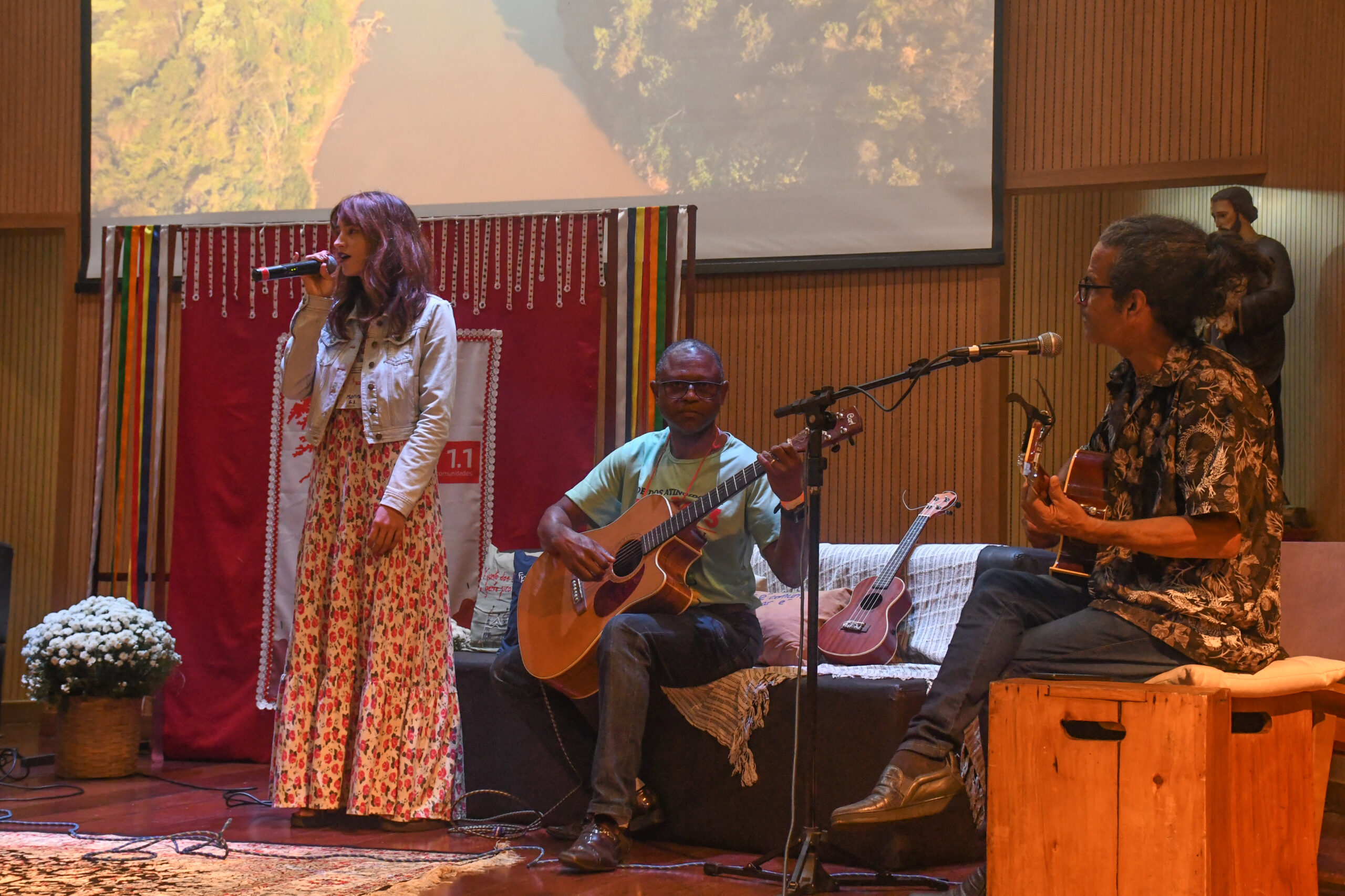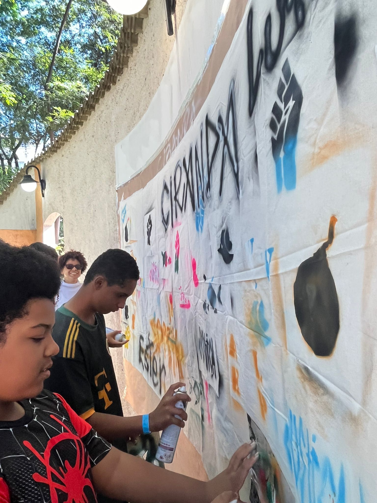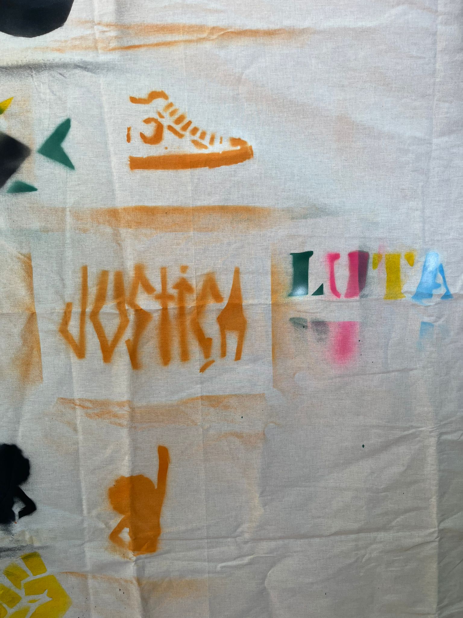 Durante o almoço de domingo, eles fizeram uma intervenção cantando, batucando e apresentando os trabalhos realizados ao longo do encontro. Na paródia cantada por todos os presentes, as crianças e adolescentes destacavam na letra a importância de se organizarem como grupo em prol da luta pela reparação. Nas faixas produzidas com stencil em material natural, traziam frases e desenhos sobre a luta popular e o cuidado com o meio ambiente.
