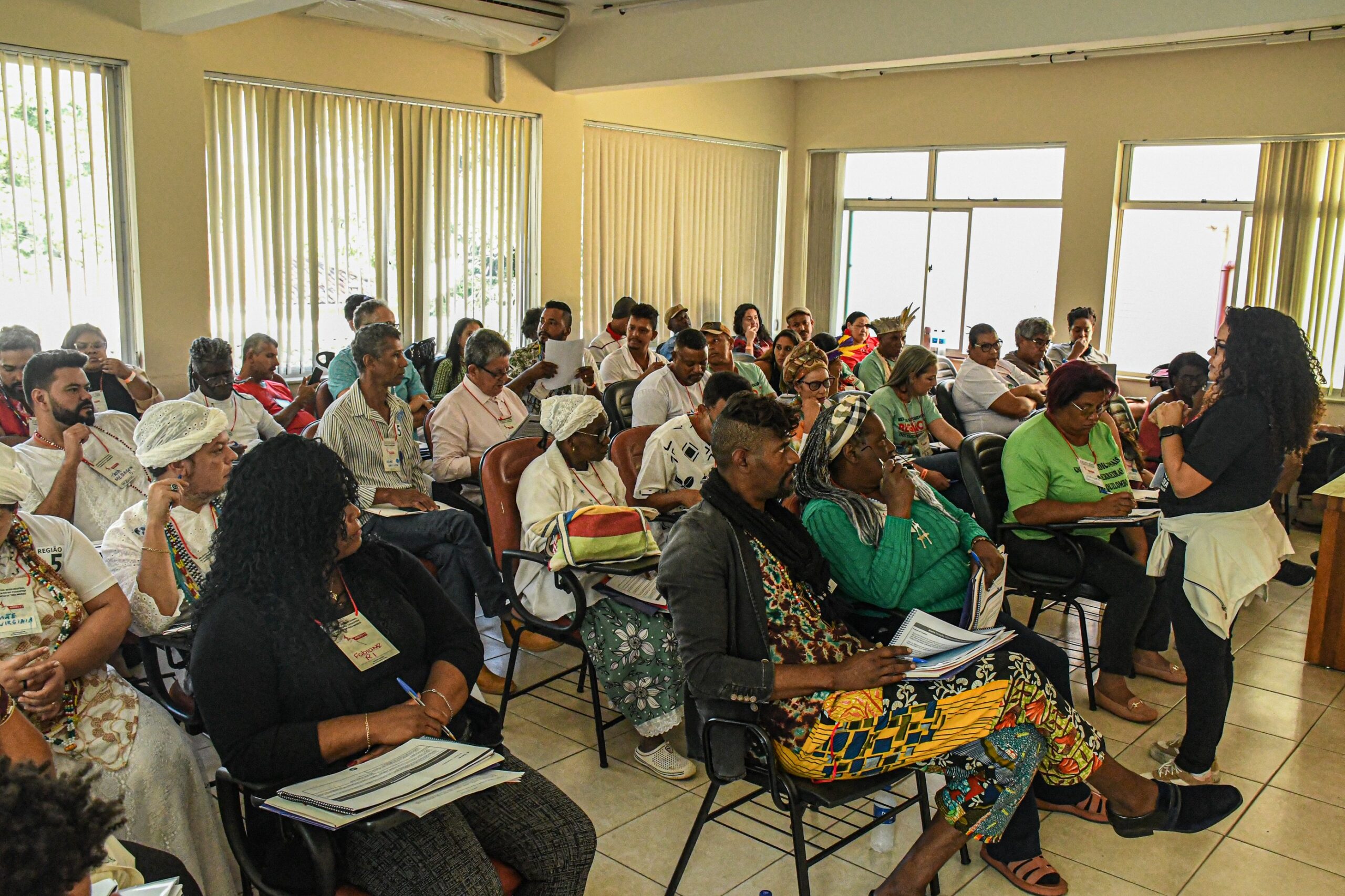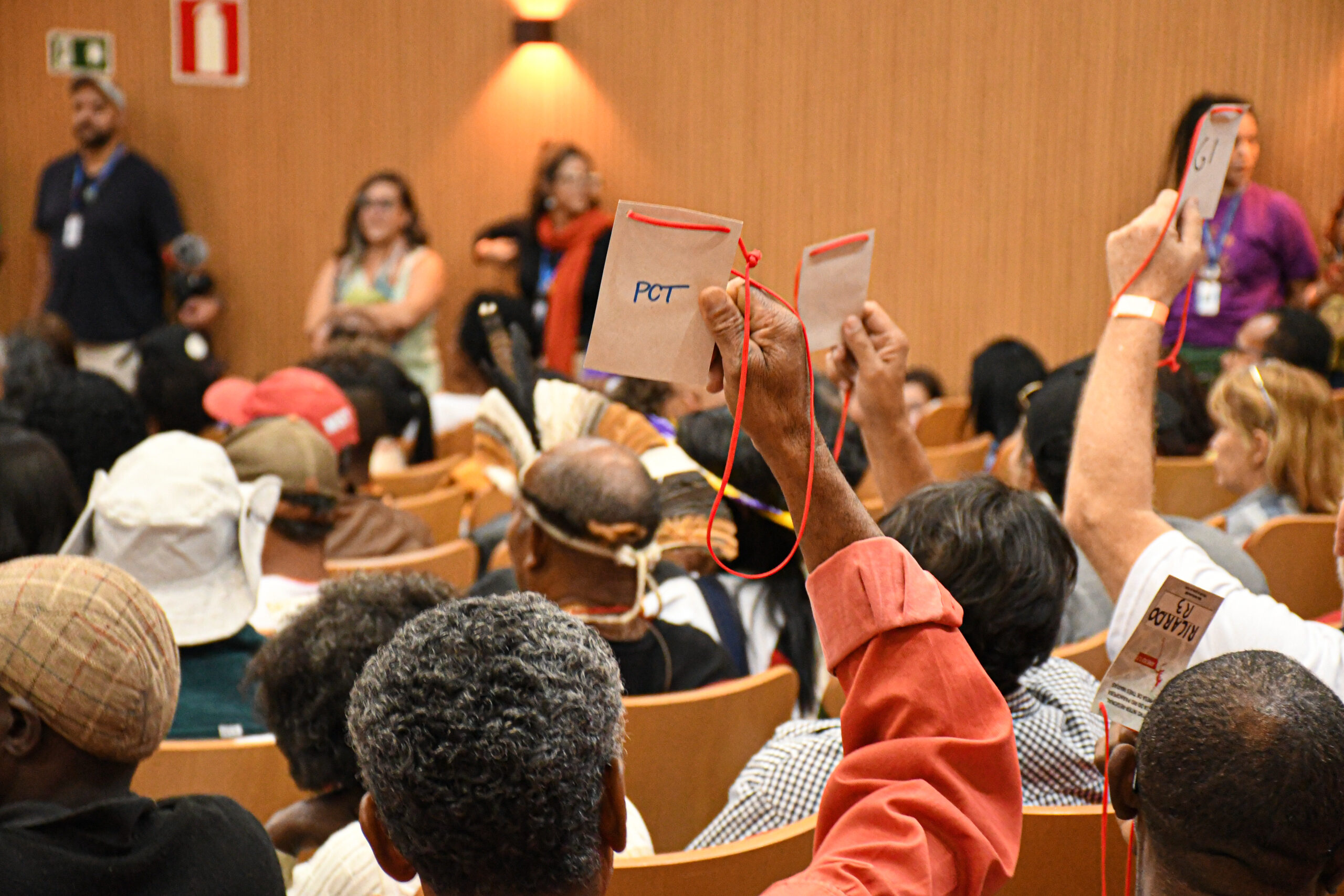 Os Povos e Comunidades Tradicionais contaram com um espaço de debate e deliberação específico para discutir e aprovar as propostas que vieram sistematizadas dos momentos preparatórios nos territórios. Depois de um intenso debate, as lideranças aprovaram um conjunto de resoluções que comporão a proposta definitiva. No grupo dos Povos e Comunidades Tradicionais, as propostas de resoluções foram discutidas e aprovadas no próprio espaço, por se tratar de questões específicas que não devem ser apreciadas em plenária para validação, respeitando suas especificidades e o protocolo de consulta.