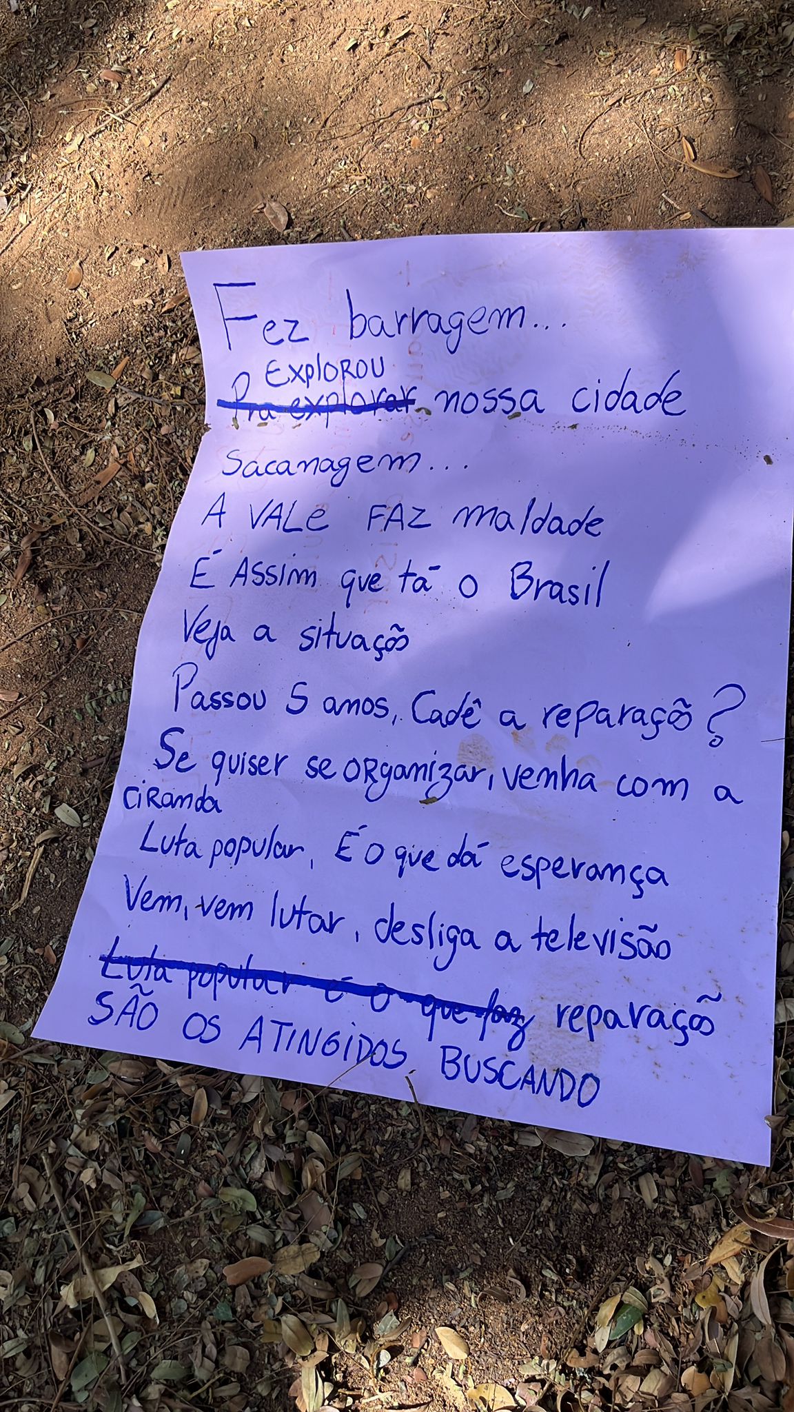 Maria Aparecida (Paré), familiar de vítima fatal e moradora do Tejuco, comunidade de Brumadinho, compartilhou “Eu estava na horta no dia 25 de janeiro de 2019 quando a tragédia aconteceu. Meu irmão estava na outra horta, e não deu tempo de correr. Ele não trabalhava na mineração, gente, ele era agricultor. Sinto-me mais próximo do Paulo quando estou na luta. Ele também gostava muito de lutar. Sempre que estou em movimento, estou perto dele. Digo que não é fácil largar tudo e estar aqui, mas lutamos por todos, não de forma individual”.