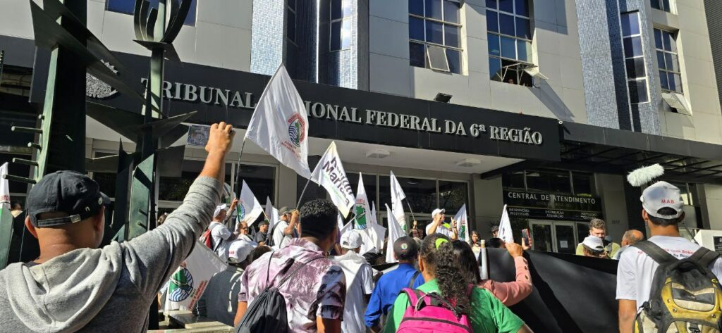 Atingidos e atingidas da bacia do Rio Doce assessorados pela Associação Estadual de Defesa Ambiental e Social (Aedas), junto a representantes do movimento social dos Atingidos por Barragens (MAB), se reuniram na sede do Tribunal Regional Federal da 6° Região (TRF6) para protestar, na manhã desta segunda-feira (17), em Belo Horizonte, contra a falta de transparência e participação nas negociações do acordo de repactuação sobre os danos causados pelas mineradoras Samarco, Vale e BHP Billiton, responsáveis pelo rompimento da barragem de Fundão.