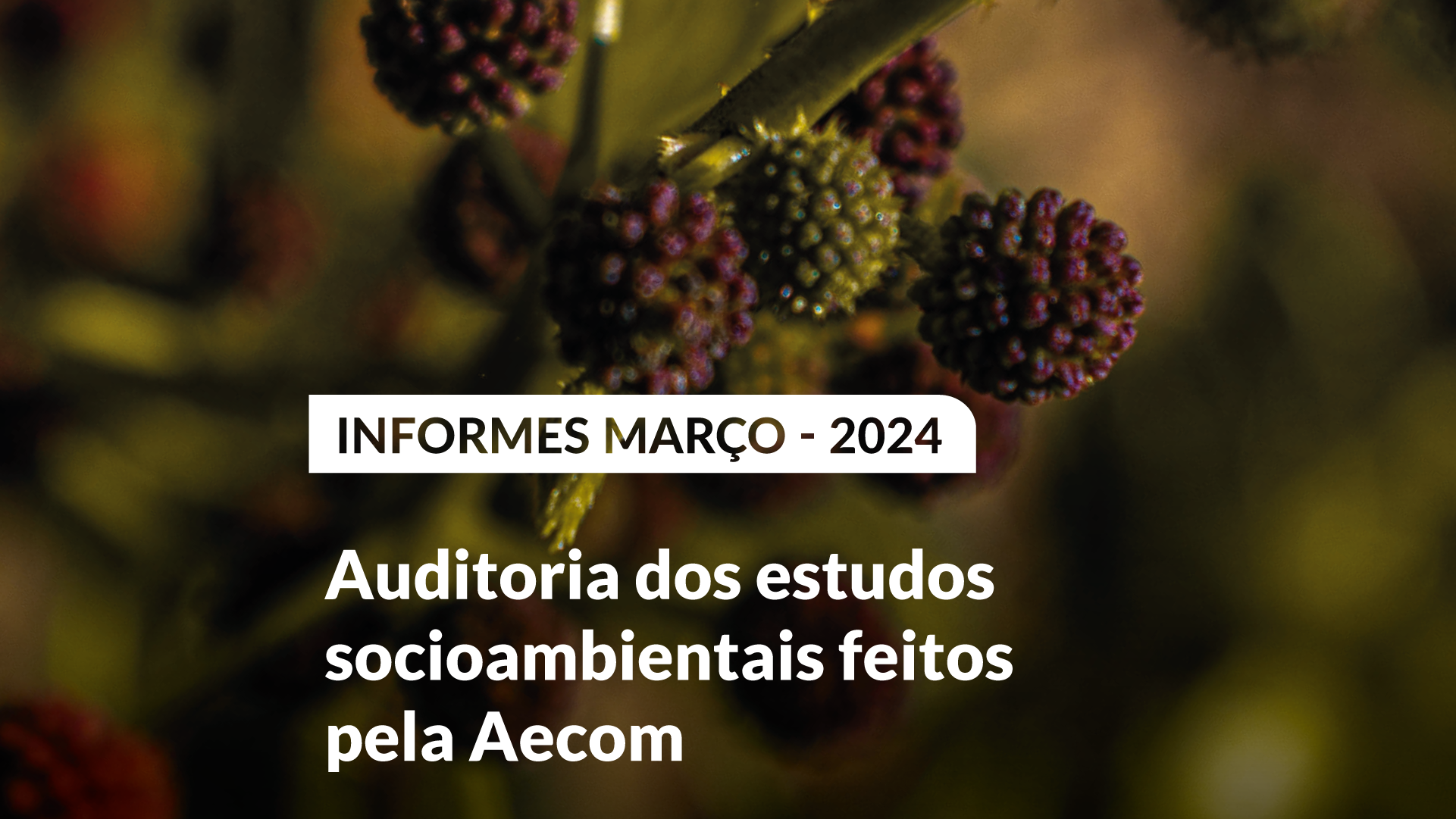 No dia 20 de março de 2024 foi realizada a reunião da AECOM, empresa responsável pela auditoria independente dos estudos socioambientais na Bacia do Rio Paraopeba. Mensalmente a AECOM, através de uma reunião virtual, apresenta para as IJs os resultados das atividades alcançadas no mês decorrido e a atualização quanto ao cumprimento ou não dos cronogramas dos projetos e ações. As ATIs participam desta reunião exclusivamente como ouvintes e não há espaço para falas, dúvidas e/ou intervenções.