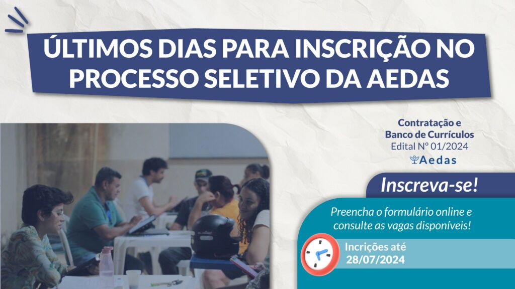 As inscrições para o processo seletivo da Aedas seguem abertas até o próximo domingo, dia 28 de julho, e oferece vagas em Belo Horizonte, Governador Valadares, Ipatinga e Itatiaiuçu