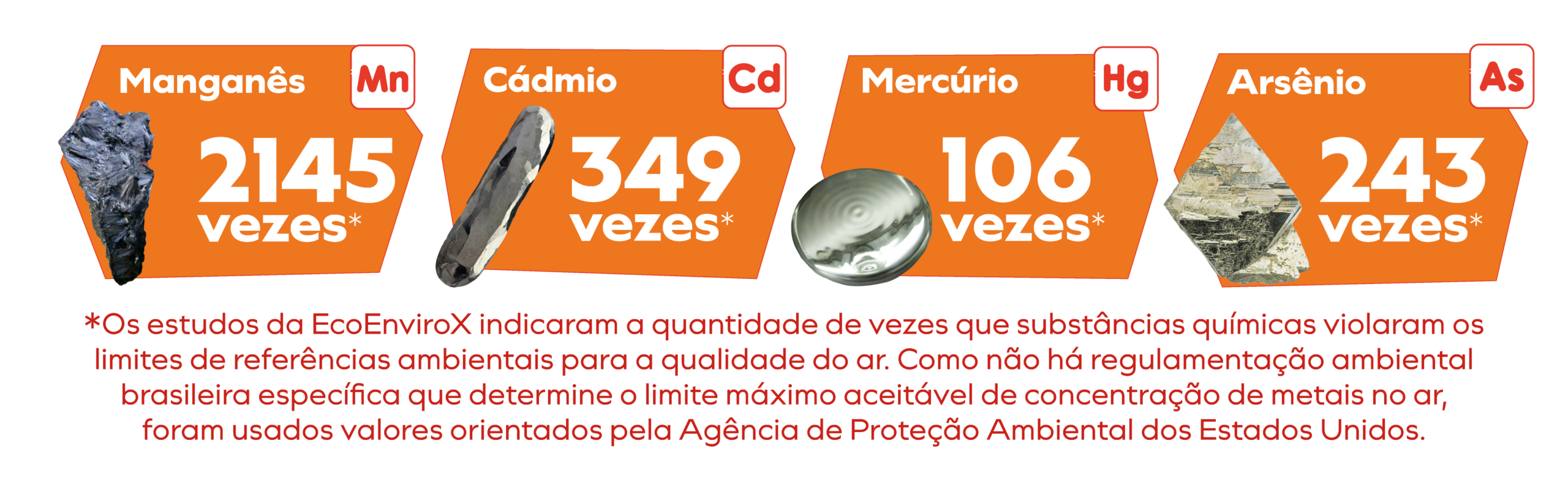 O mapa apresenta 28 amostras, coletadas em 21 locais diferentes, onde foi analisada a Qualidade do Ar. De todos os pontos, apenas um não registrou a presença de metais acima dos parâmetros estabelecidos pelas normas. Ao todo, foram 47 violações em relação aos valores de referência para arsênio, manganês e mercúrio.