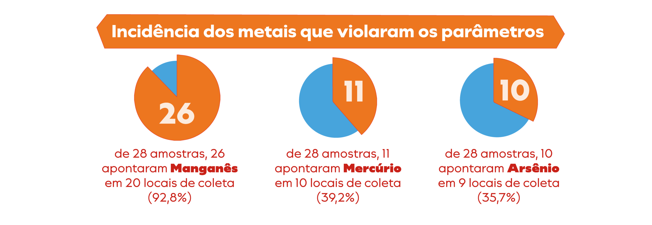 Os resultados indicaram a presença de cerca de 13 substâncias químicas potencialmente prejudiciais à saúde humana que violaram os limites de referências estabelecidos por normativas ambientais. Substâncias como arsênio, cromo, chumbo, manganês e cádmio são os exemplos mais preocupantes, já que passaram dos limites máximos dos valores de referência para diversas amostras analisadas.