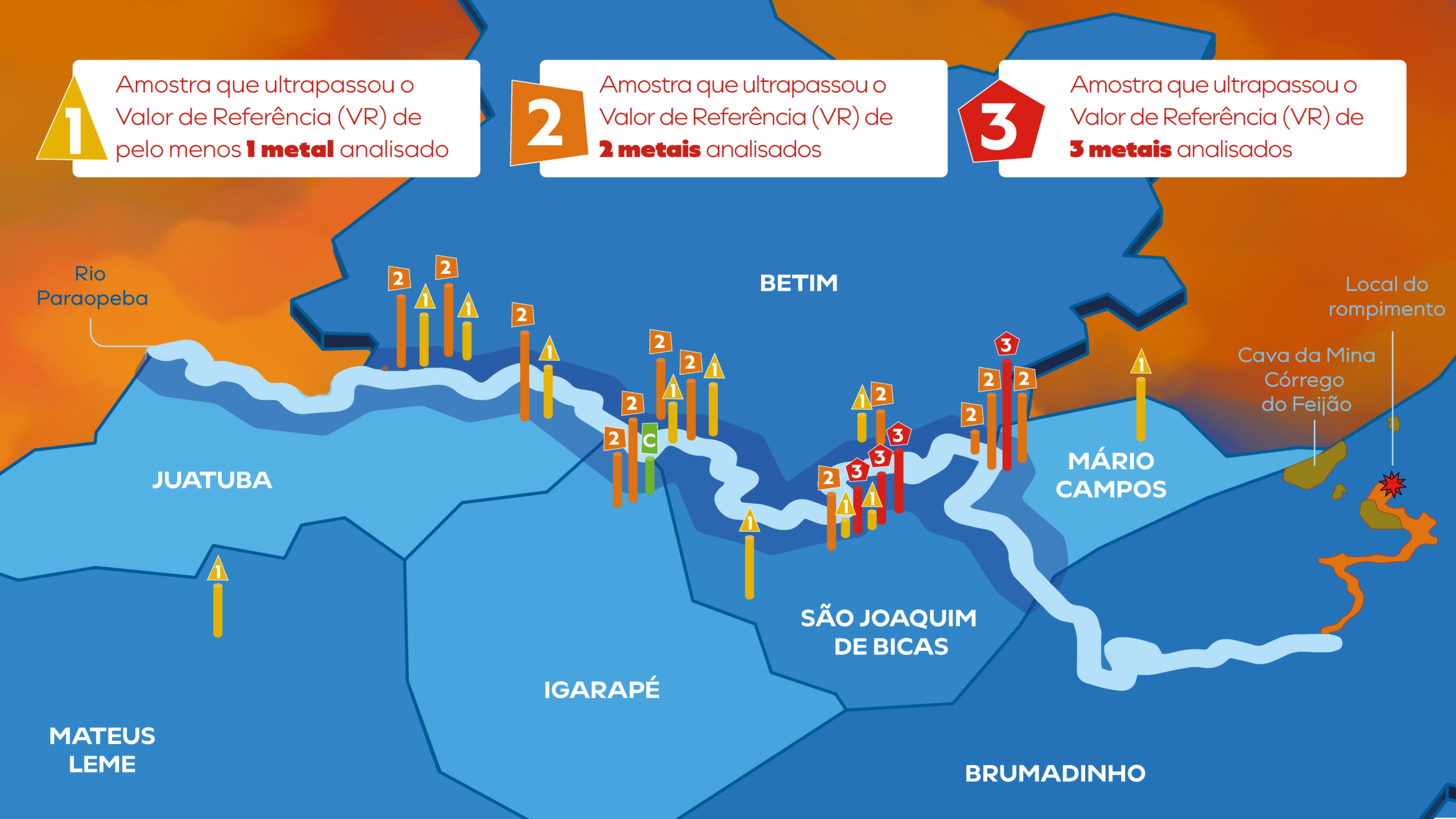 Outro destaque foram os altos níveis de manganês nas águas do Paraopeba após a confluência com o ribeirão Ferro-Carvão, sugerindo uma relação direta com os rejeitos provenientes do rompimento da barragem da Vale.