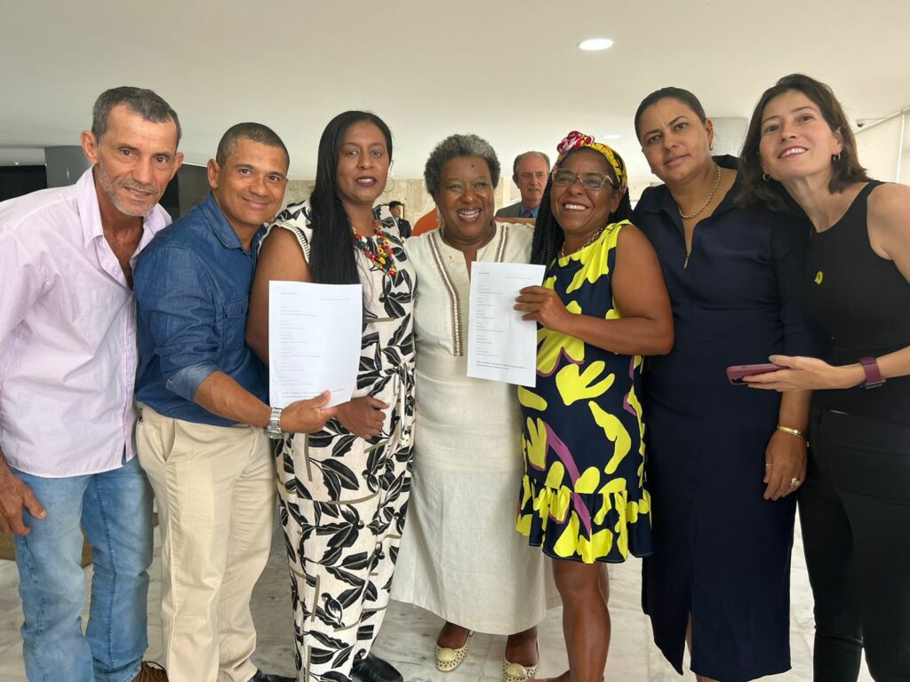 Pessoas atingidas pelo rompimento da barragem de Fundão entregam carta à ministra Macaé Evaristo (ao centro) Foto: Arquivo das ATIs