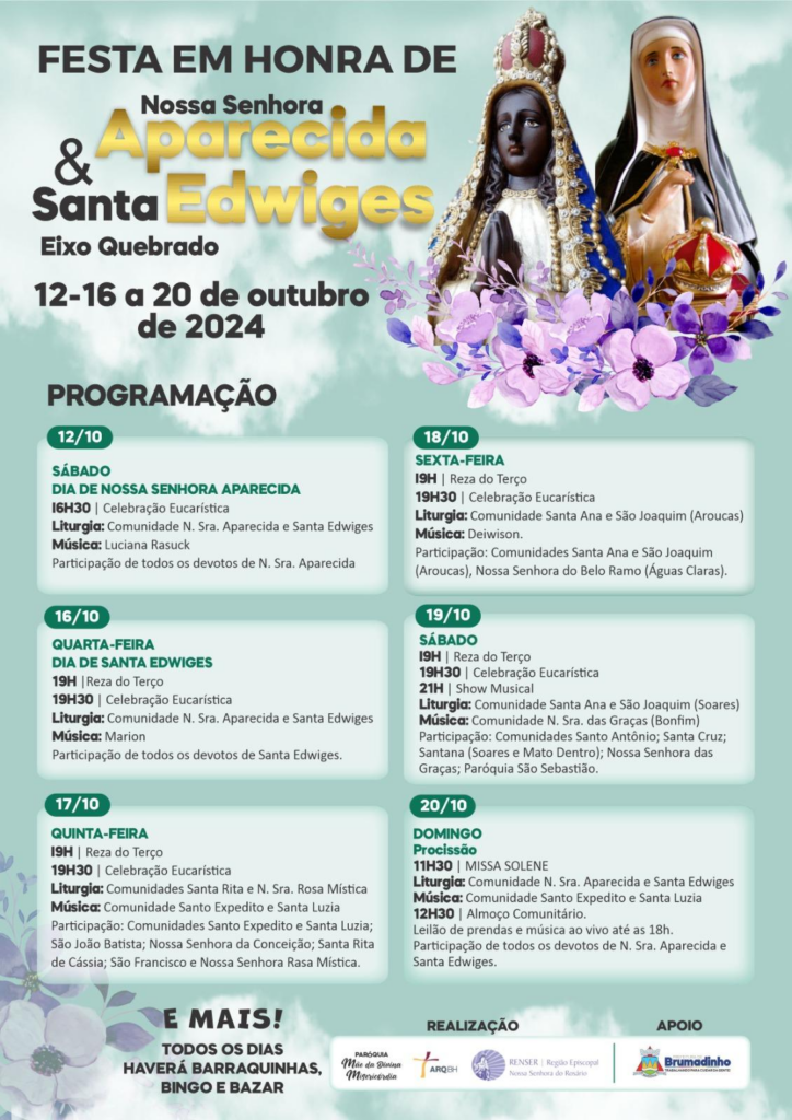 A Festa em honra de Nossa Senhora Aparecida e Santa Edwiges, realizada no Eixo Quebrado, em Brumadinho, acontece neste sábado em domingo, 19 e 20 de outubro. No sábado, a festividade tem início às 19h com uma Reza do Terço e Celebração Eucarística, seguida de atração musical, às 21h.