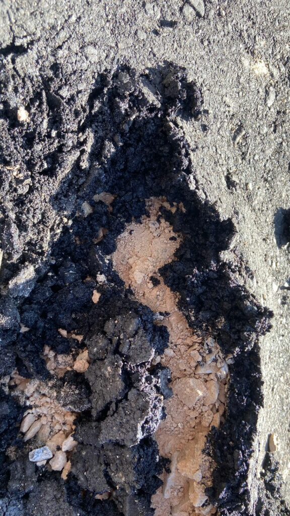 Falta de sistema de drenagem e fina camada asfáltica em rua do bairro Fernando Costa. Foto: acervo da comunidade (08/2024).