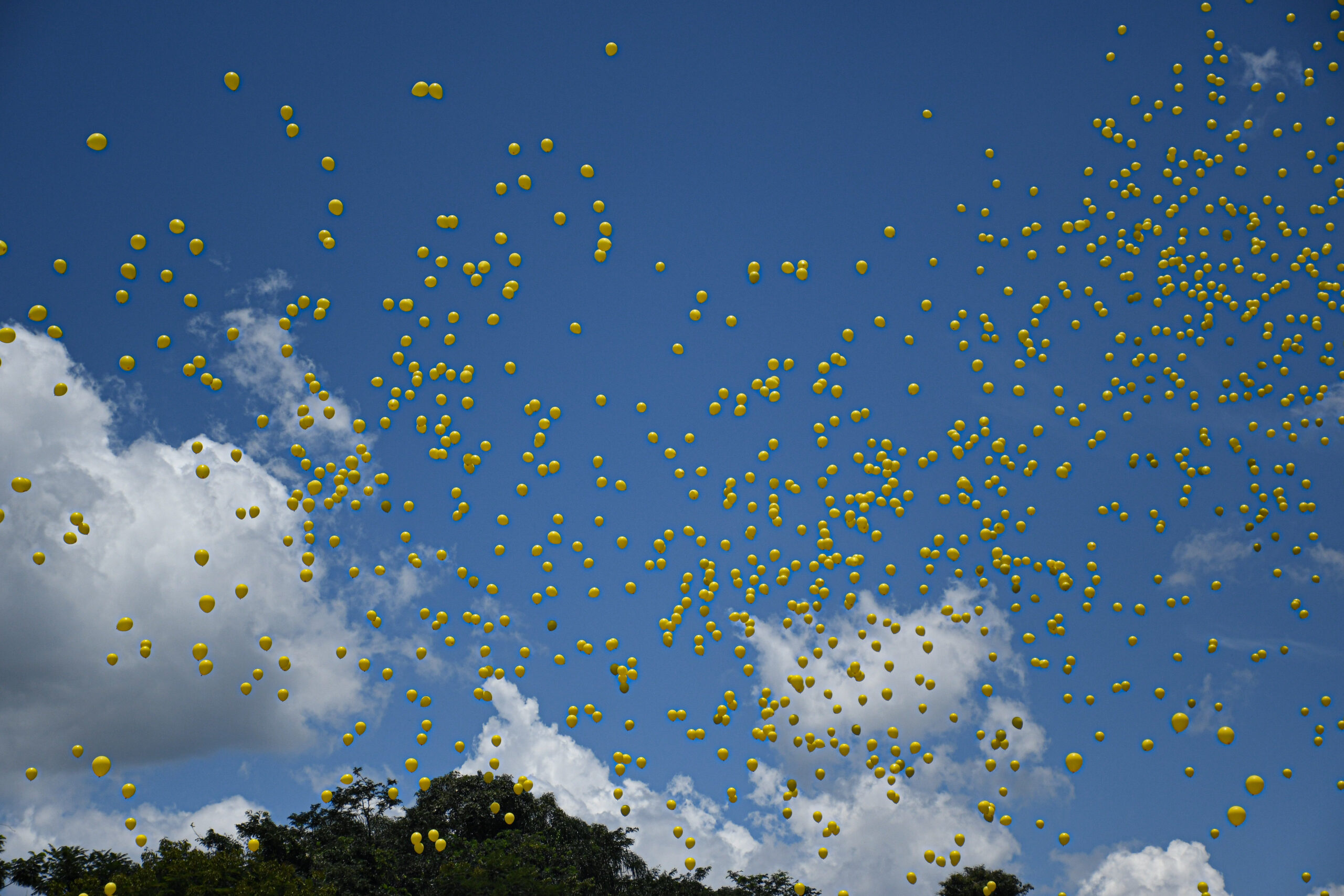 Balões com sementes de girassóis foram lançados ao céu de Brumadinho representando o número de dias desde o desastre-crime; são 2.195 | Foto: Felipe Cunha