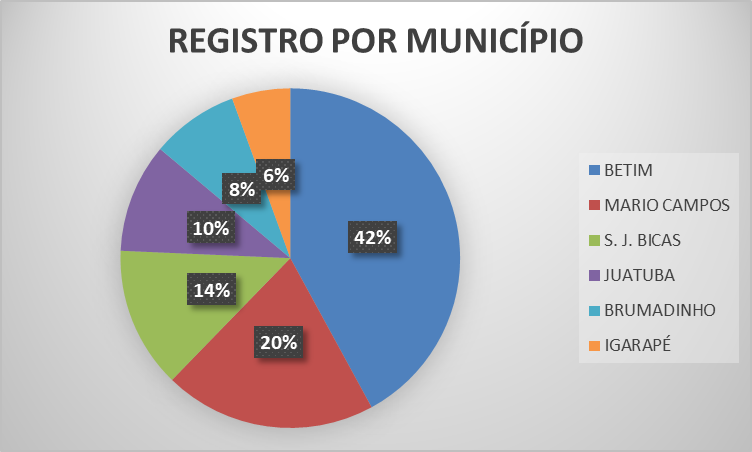 A seguir, também é possível verificar a porcentagem de atendimentos por município em 2024, sendo 545 provenientes de Betim, 262 de Mário Campos, 174 de São Joaquim de Bicas, 135 de Juatuba, 108 de Brumadinho e 72 de Igarapé, que correspondem a 42%, 20%, 14%, 10%, 08% e 06% respectivamente, conforme gráfico abaixo: