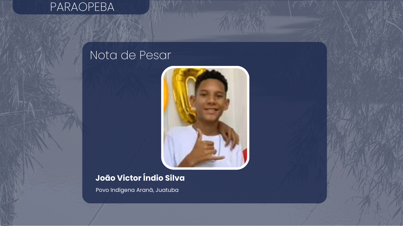 A Associação Estadual de Defesa Ambiental e Social (Aedas) manifesta seu profundo pesar pelo falecimento de João Victor Índio Silva, do Povo Indígena Aranã, em Juatuba.