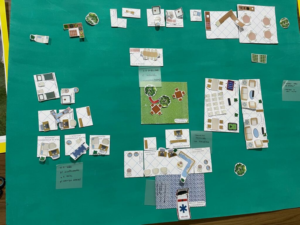 Para facilitar a compreensão, as pessoas atingidas participaram de uma dinâmica que usou símbolos impressos dos cômodos e mobiliários que poderiam compor os equipamentos de saúde mental. Com isso, “brincaram” e criaram, como engenheiras e arquitetas, os espaços que gostariam de ter nas comunidades atingidas.