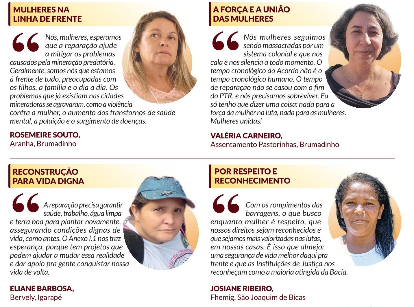 As mulheres reivindicam o início do Anexo I.1. É necessário ações específicas para as mulheres para os projetos das comunidades. Elas são expostas a partir das especificidades, aos danos socioeconômicos da reparação e devem ter percentuais específicos de recursos, projetos e espaços de participação e liderança, sobretudo, no que se refere aos danos ao trabalho formal e informal, além do trabalho direcionado ao cuidado numa perspectiva de invisibilização e não remuneração.