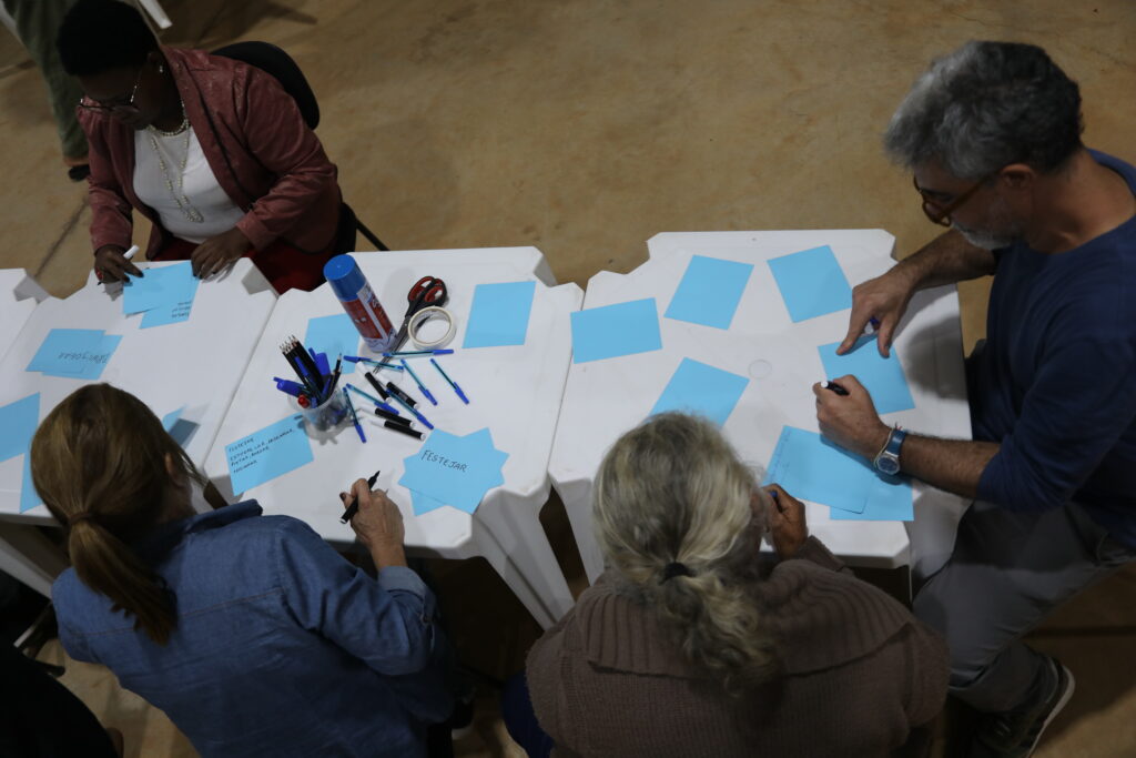 A proposta foi transformar sensações em palavras e promover um olhar crítico sobre os espaços visitados. Durante a reunião, a equipe da Peabiru mostrou uma síntese das oficinas realizadas em fevereiro nas comunidades de Pinheiros e Vieiras, além de exemplos de centros comunitários autogeridos em outros estados.