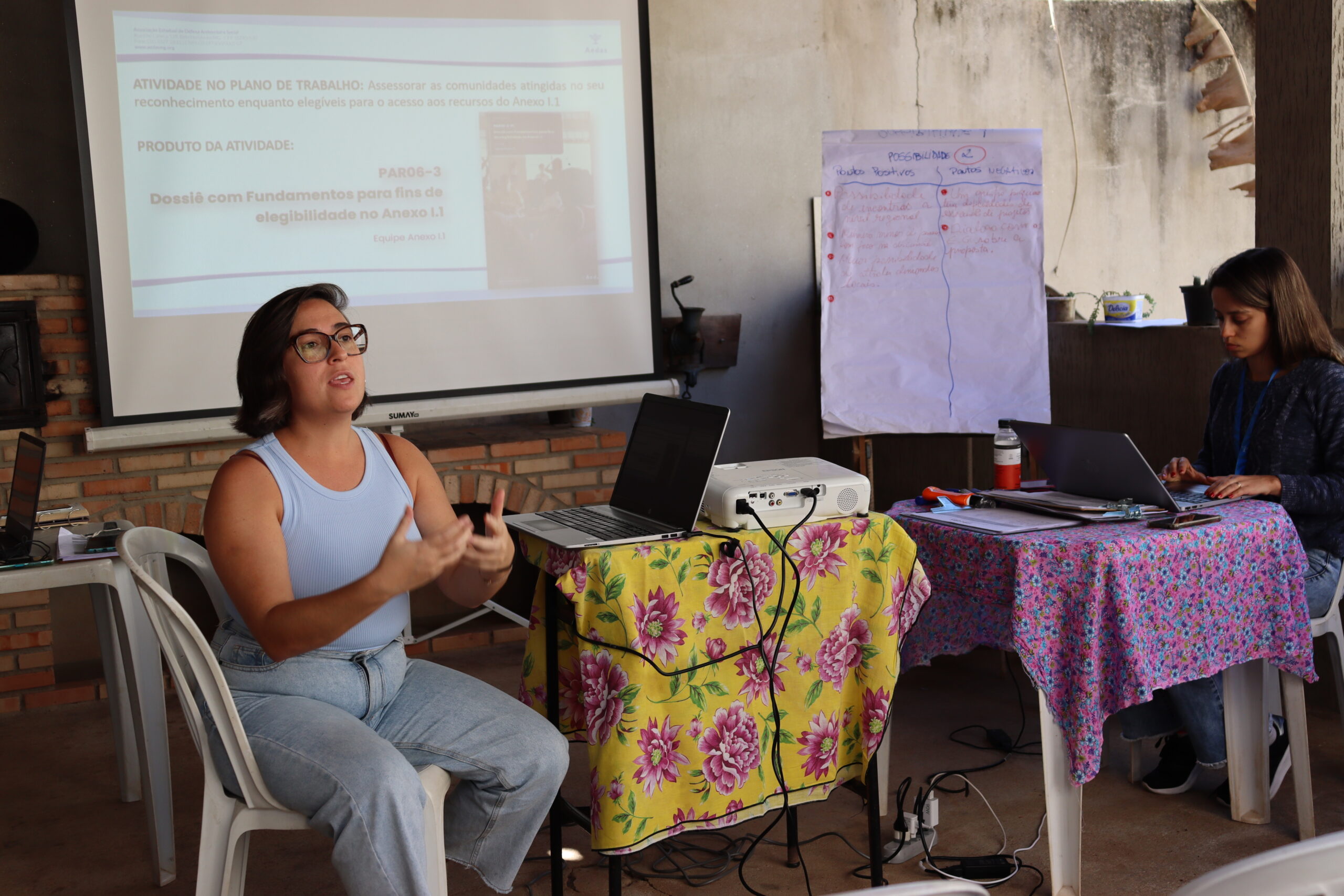 Juliana Funari, coordenadora na equipe da Aedas que assessora as comunidades nos temas do Anexo I.1, explica sobre os temas dialogados nessa rodada com as pessoas atingidas.