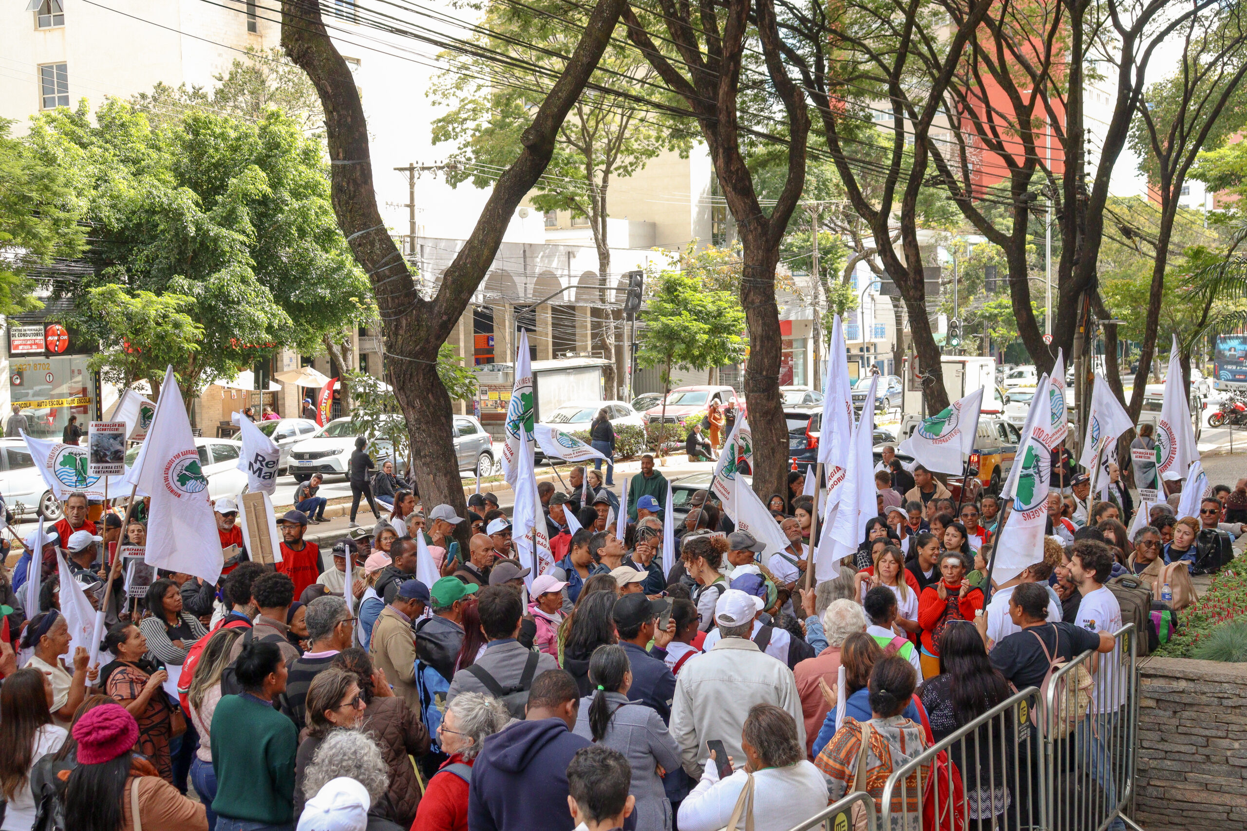 Em seguida, ainda pela manhã, as lideranças atingidas seguiram em marcha até o Tribunal de Justiça de Minas Gerais (2ª Instância) para protocolar uma nova pauta de reivindicações sobre o Auxílio Emergencial, durante uma reunião com a juíza Maria Dolores e o juiz auxiliar da presidência, Marcelo Fioravante. Na porta do tribunal, as atingidas e atingidos realizaram ato público para exigir a continuidade do auxílio — considerado essencial para garantir a dignidade das famílias enquanto a reparação não é concluída.