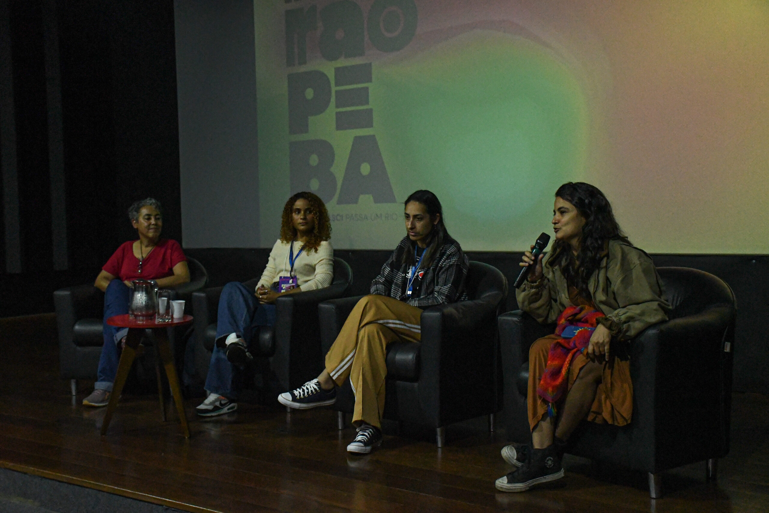Sheila Rodrigues, diretora e professora da Escola Municipal Newton Amaral Franco, de Contagem, Scarlet Souza, Janaina Rocha e Luana Farias da Aedas no debate após exibição dos filmes Sessão Águas Infantil | Foto: Felipe Cunha/Aedas